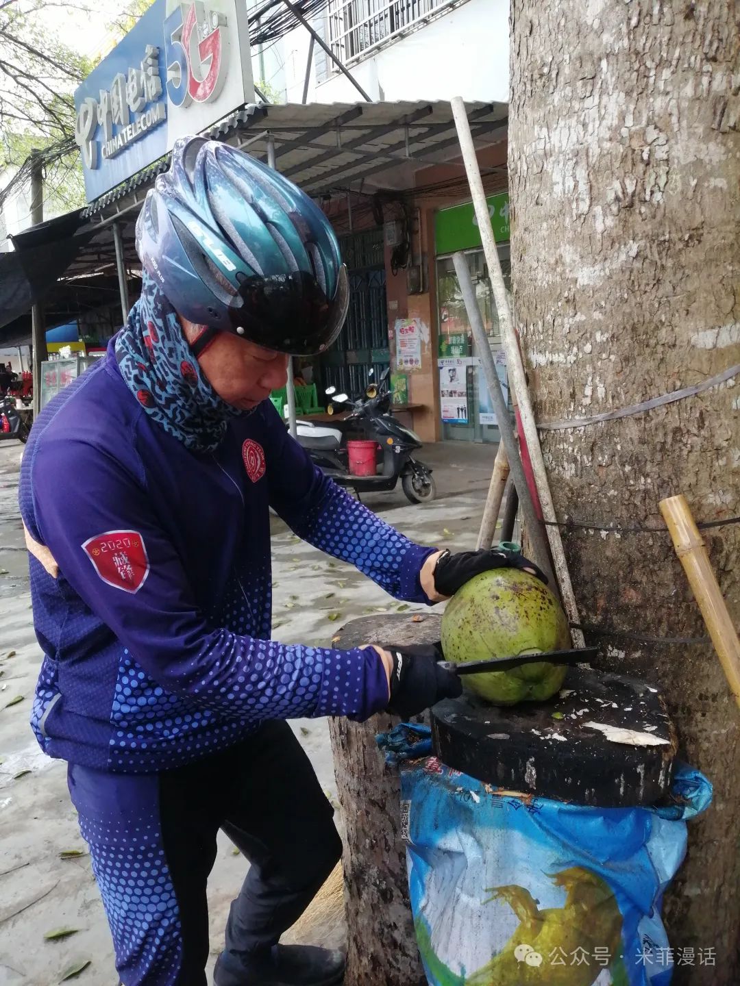 快到目的地了,突然间想起今天还没喝椰子,路边随便一家小店两样东西必卖,一个是槟榔,一个是椰子。到椰子产地琼海地界了,椰子也便宜了,大的小的一律5元一个。老公坚持“自杀(椰子)”,也就是自己操刀砍开来喝,若老板替客人砍好的话则叫“他杀”,听上去怪恐怖的。不过,琼海的椰子品质相当好,甜度高且汁水足。