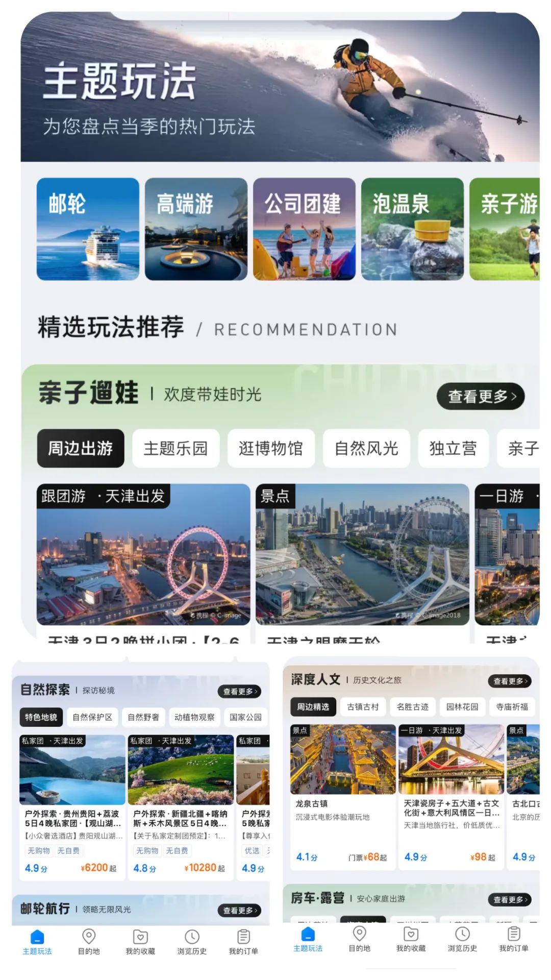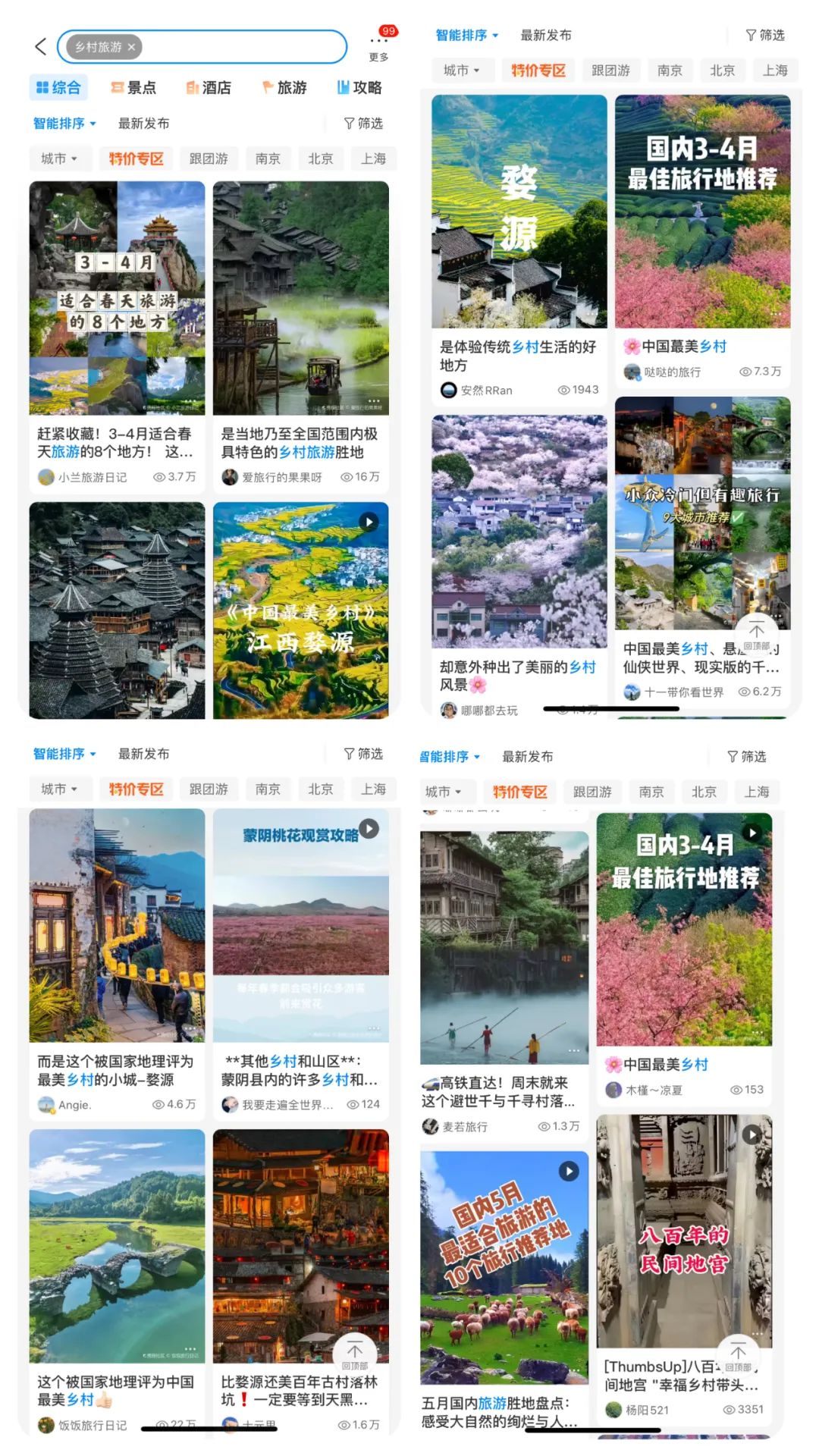 虽然这其中也夹杂着几个不是乡村的旅游,但整体上已经和我们心目中的乡村旅游风格一致了。其实也就是去乡村的地上看村里的景、村里的人,住村里的屋,吃村里的饭,再过过村里的日子。那些高大上的休闲旅游项目,如果带动了周边乡村地区的餐饮、住宿、就业、交通和村民福利,那就姑且算它是乡村旅游的一环,但这个项目的单体,并不能算是乡村旅游。 现在的应用软件都很智能,会把内容做成不同主题,方便人们浏览。但是在自带的主题分类中,并没有一个叫做”乡村旅游“的类别,只有翻到深度人文那一项时才有了古镇古村。