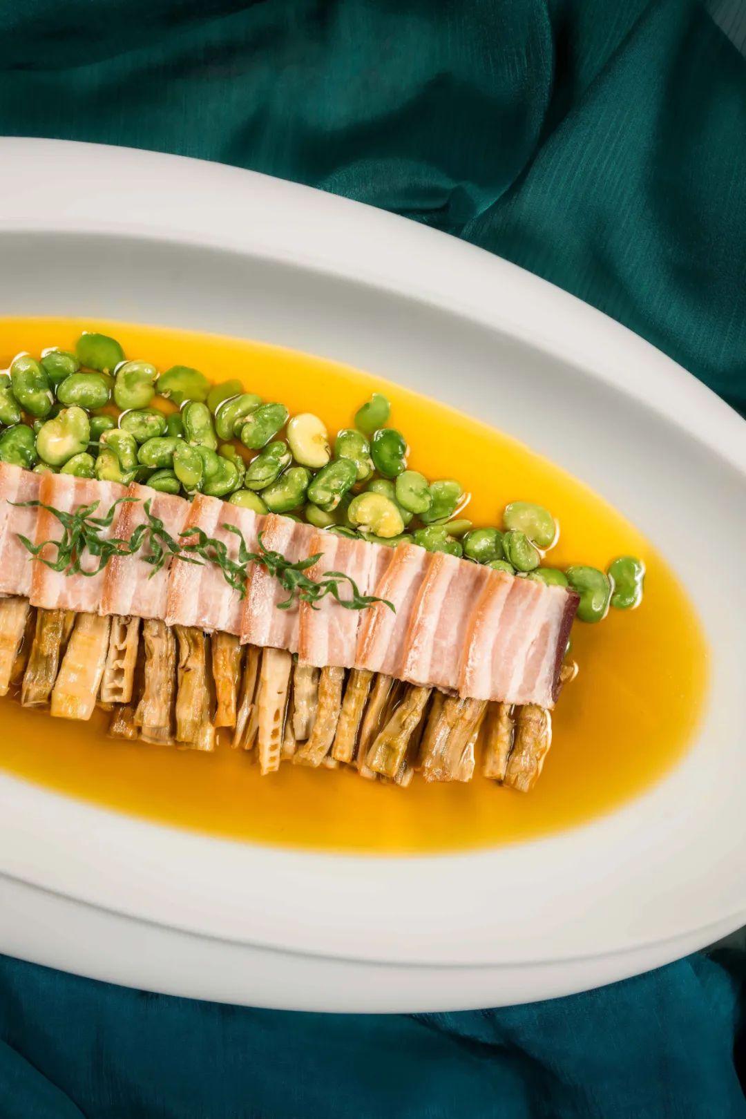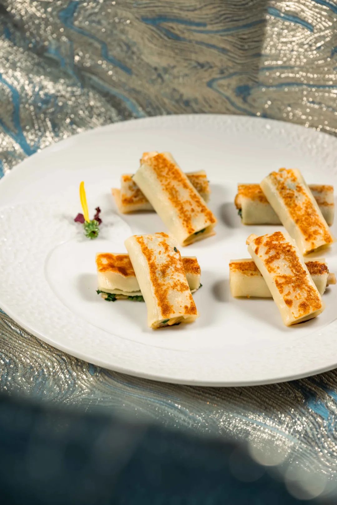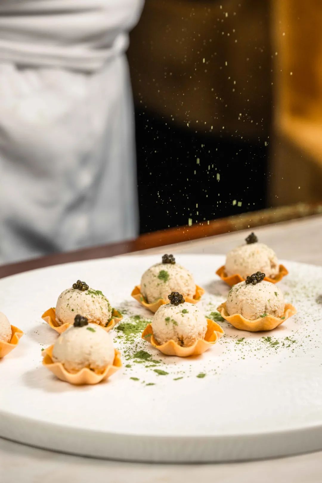 香椿的独特芬芳与绵密豆腐相融,再以樱花塔塔点缀,如同一幅美丽的画卷,唤起味蕾的艺术享受。