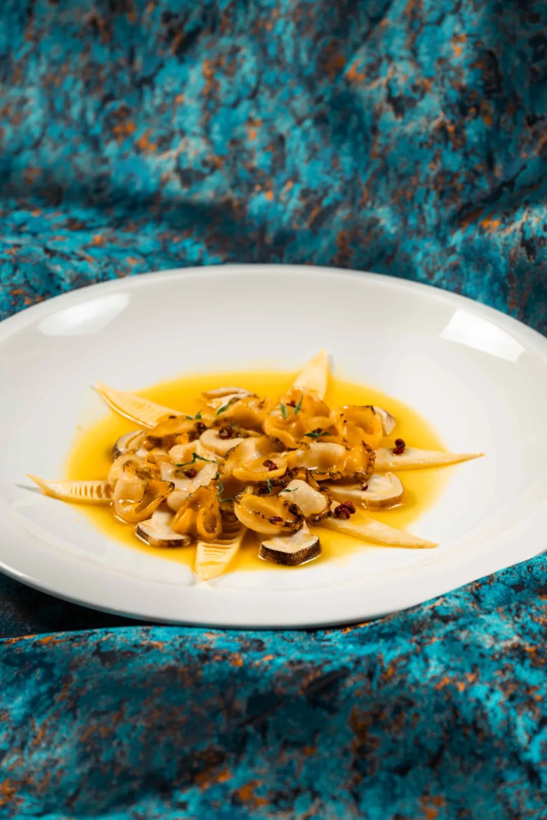 春笋、姬松茸、鲍鱼脯的高级搭配,以大红袍为底料,为美食添加了一份尊贵的味道。