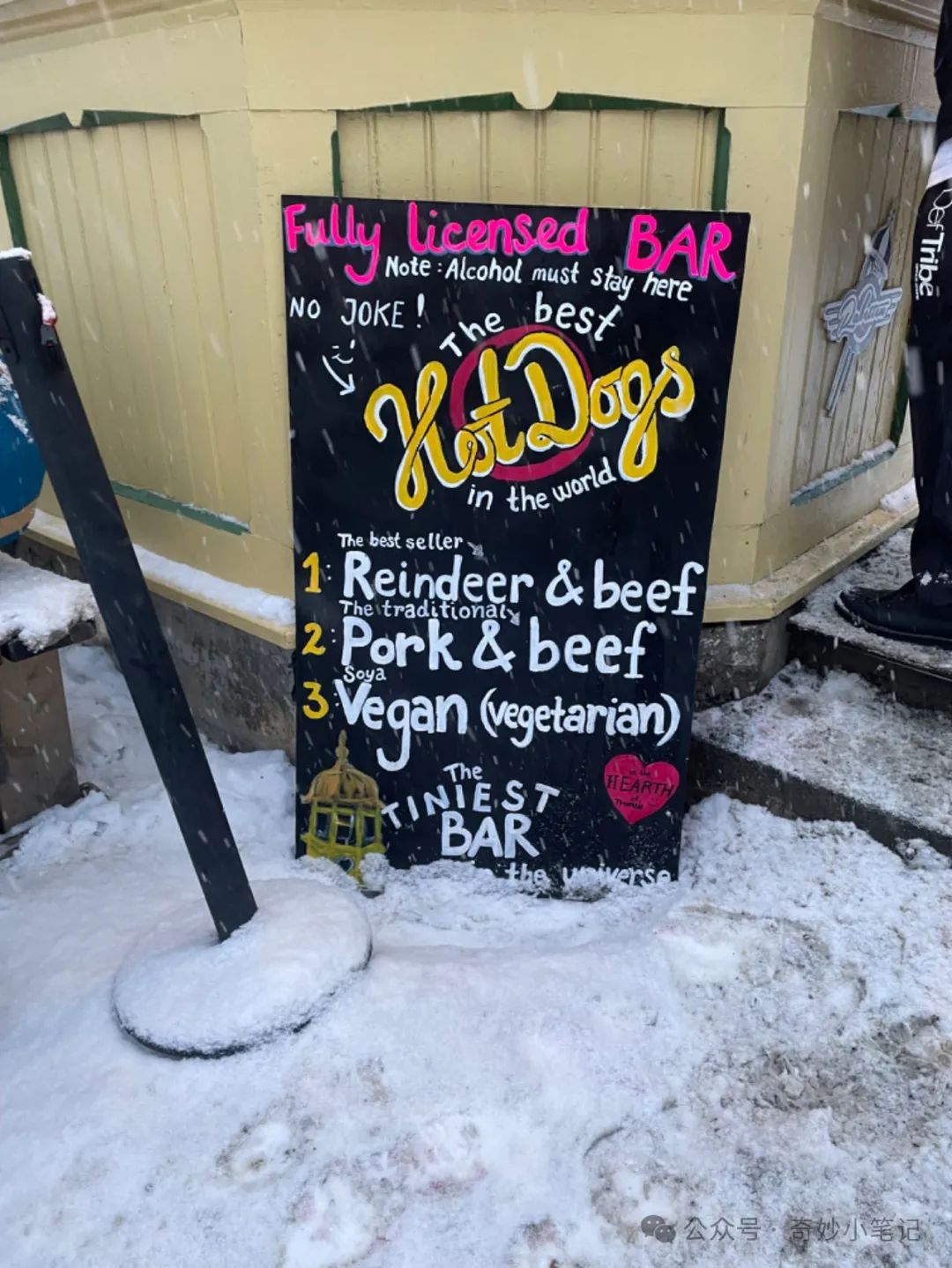 在大雪纷飞的街头排了一个钟后,我用10欧拿下一份猪肉+牛肉热狗和一杯可可,并喜提一张与这家号称全世界最小Bar的网红热狗店合影.味道还过得去,倒是这次大雪中和全世界游客一起排队打卡的故事够记一辈子了.