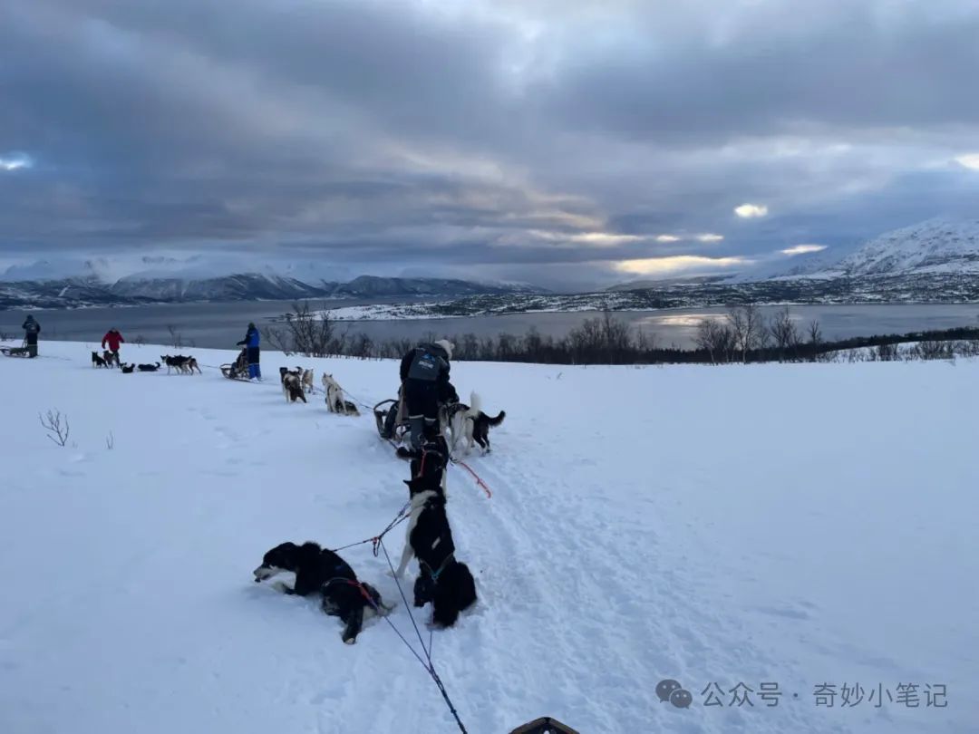 热情活泼的哈士奇拉着雪橇,带着我们驰骋在面朝雪山和峡湾的雪地,这完全是南方人做梦都不敢想的梦幻场景!别看有的狗狗边跑边拉,刹车时他们还会不满地回头翻白眼,但这可不是我们日常生活里那种二哈,能上场的全是训练有素的选手!中间一只跑略慢时队友还不时朝它狂吠:不要摸鱼拖后腿...几圈下来,我们的6只哈士奇不知何时减到了5只.可即便配置降低,速度依然飞起.最后一圈时,我怎么刹也拦不住狗子们的激情,还是超车了.