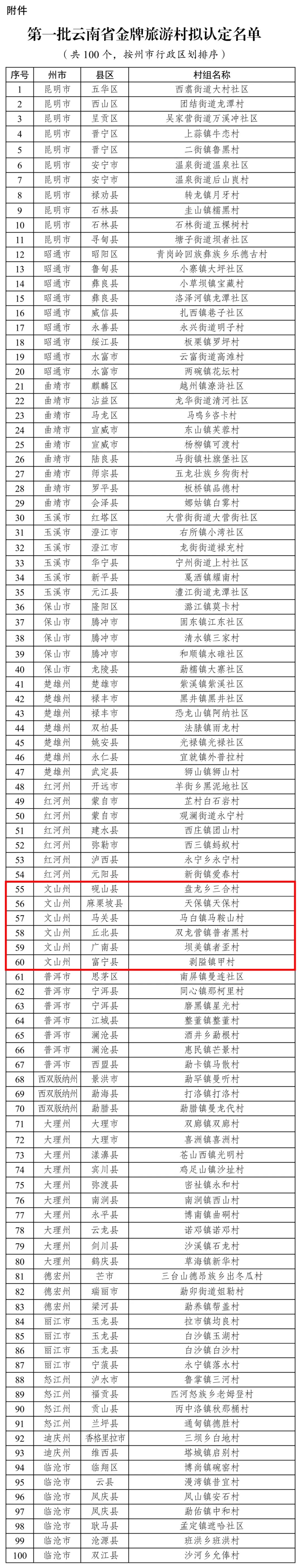 拟认定第一批云南省金牌旅游村100个 文山州