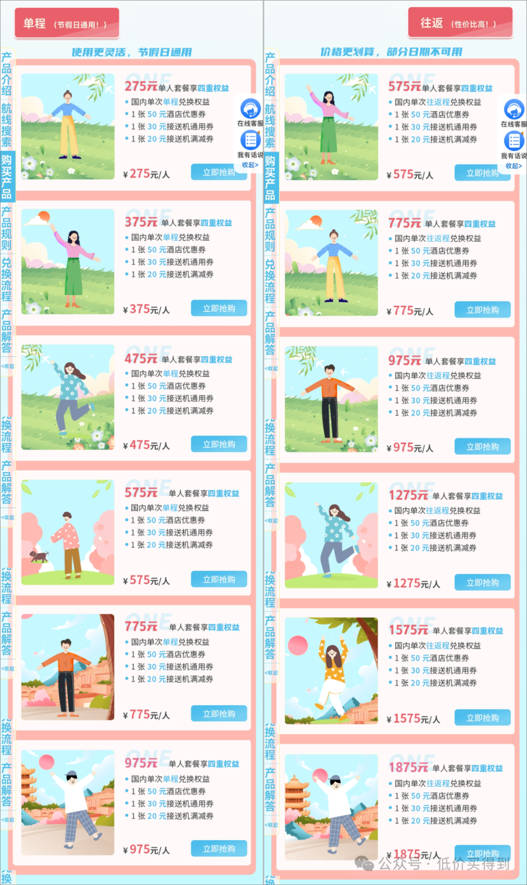 单程版,275元起/套(含税395元起/套),每套兑换一张单程机票。