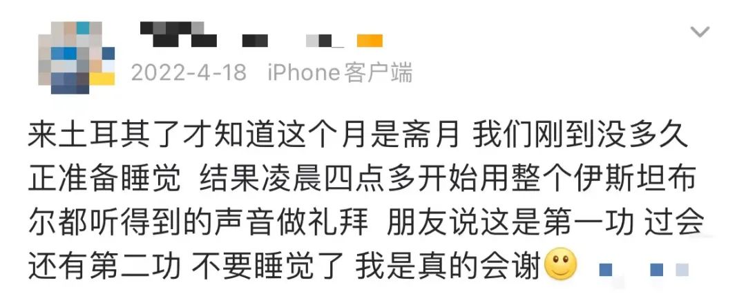 “来土耳其了才知道这个月是斋月,我们刚到没多久正准备睡觉,结果凌晨四点多开始用整个伊斯坦布尔都听得到的声音做礼拜,朋友说这是第一功,过会还有第二功,不要睡觉了,我真的会谢”