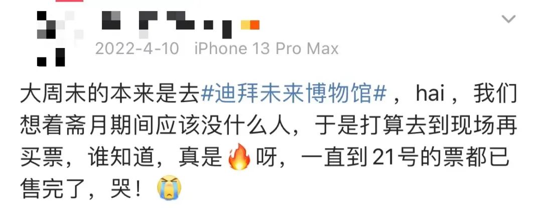 那么,对于非穆斯林的旅行者来说,在斋月期间前往穆斯林国家、地区旅行,究竟会受到什么影响呢?下面Q&A来告诉你!A:不一定。例如斋月前往印尼旅行,白天景区的游客会相对减少,可以享受到难得的清闲时光。而前往迪拜的某些热门景点,也会遇到一票难求的状况。“大周末的本来是去迪拜未来博物馆,hai,我们想着斋月期间应该没什么人,于是打算现场再买票,谁知道,真是🔥呀,一直到21号的票都售完了,哭!”