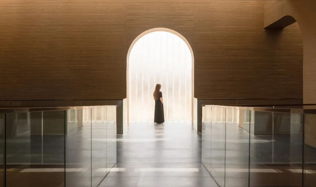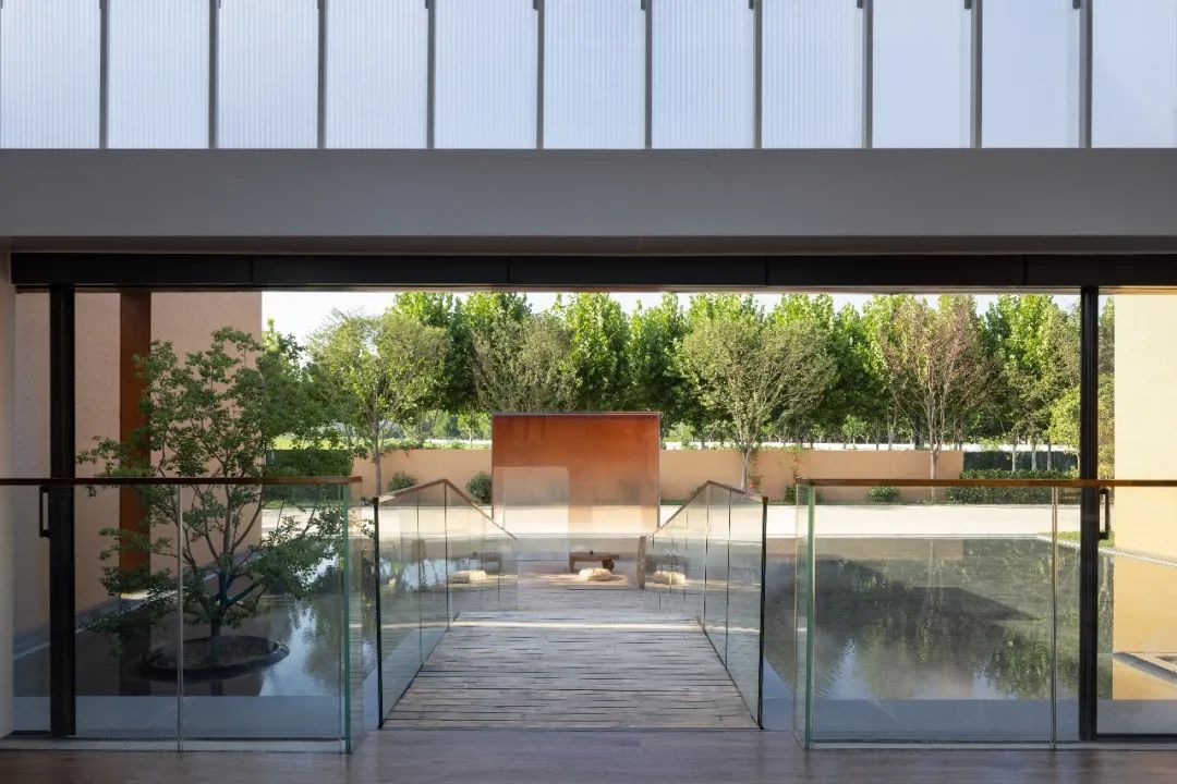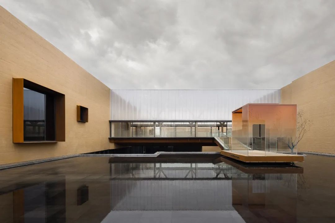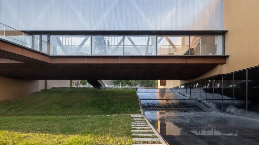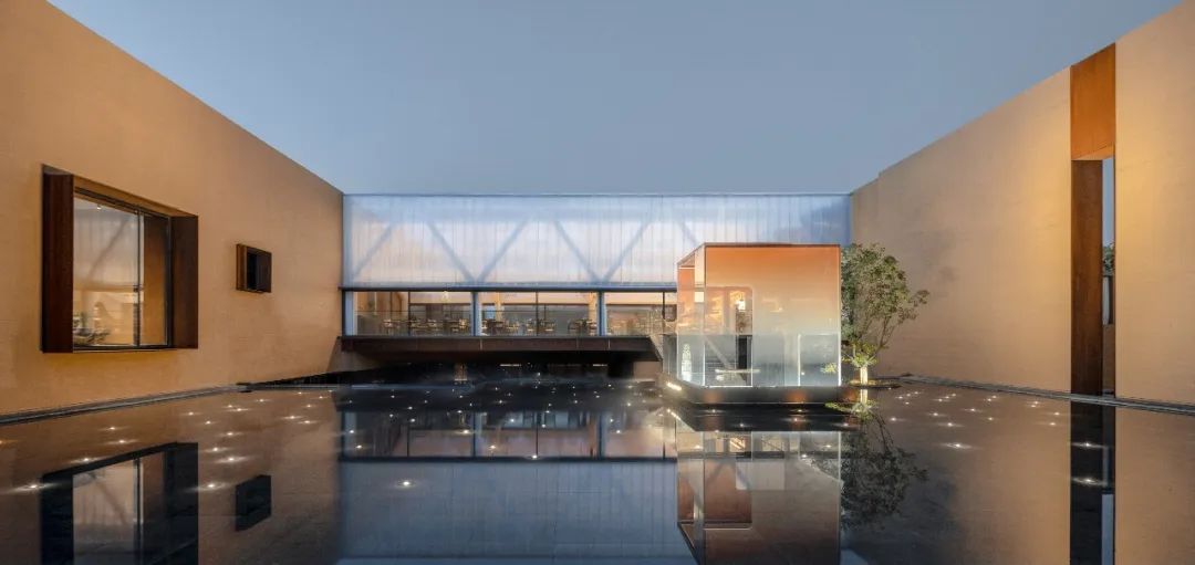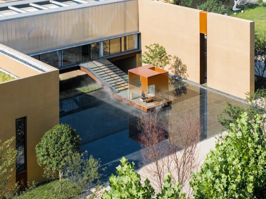 因地制宜的下沉庭院,让建筑仿佛从自然中生长出来;采用黄土色清水混凝土保持与大地相似的色彩与质感,不冲击和破坏城市风景;还有极具东方韵味的架空“米纸灯笼”茶室、静水面、水楼梯和水面橙色玻璃亭为整个建筑增添了神秘色彩。