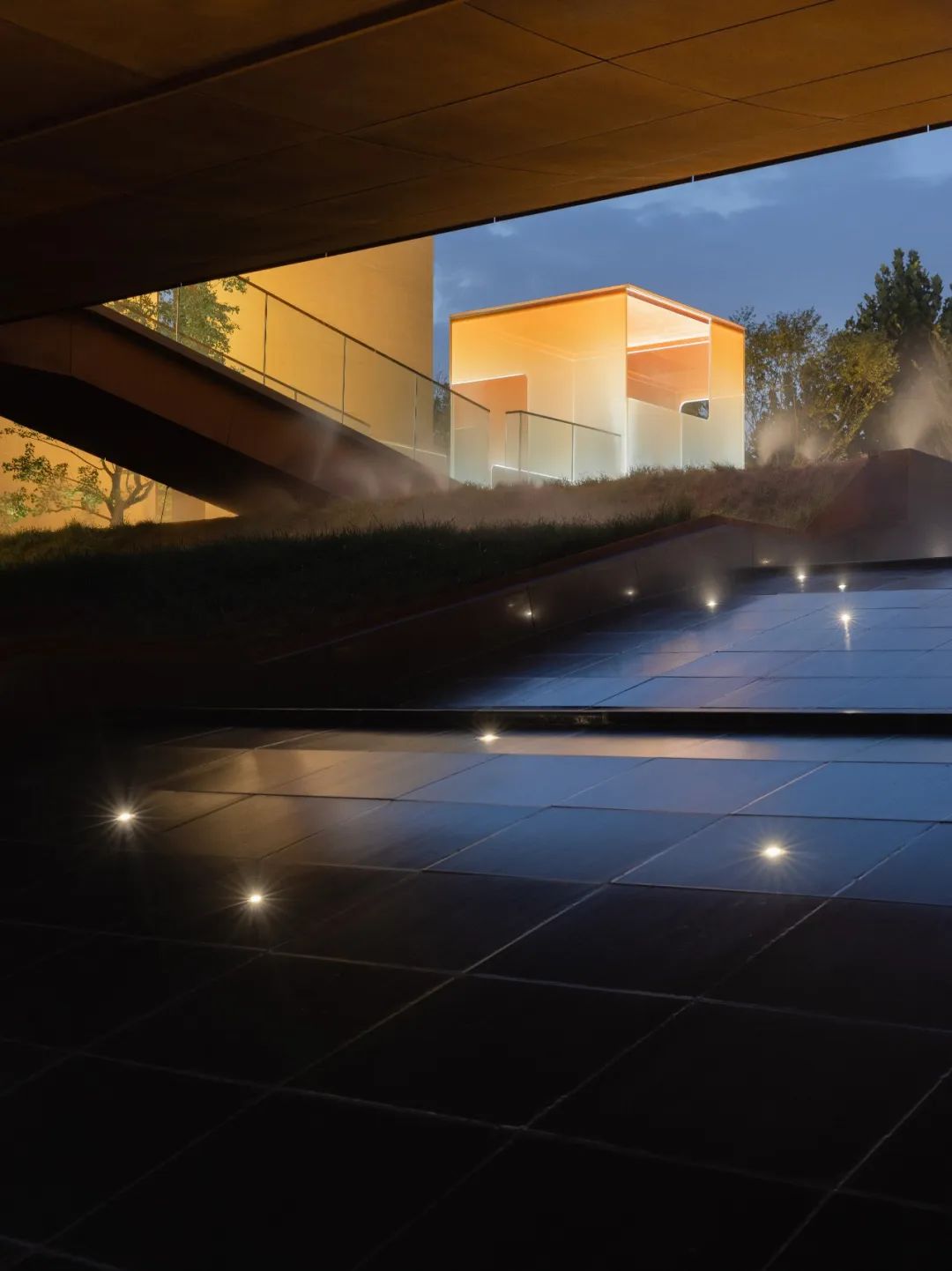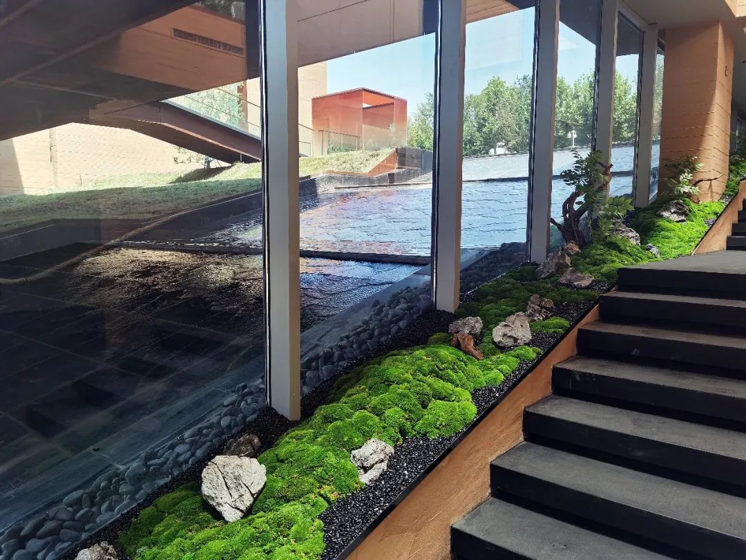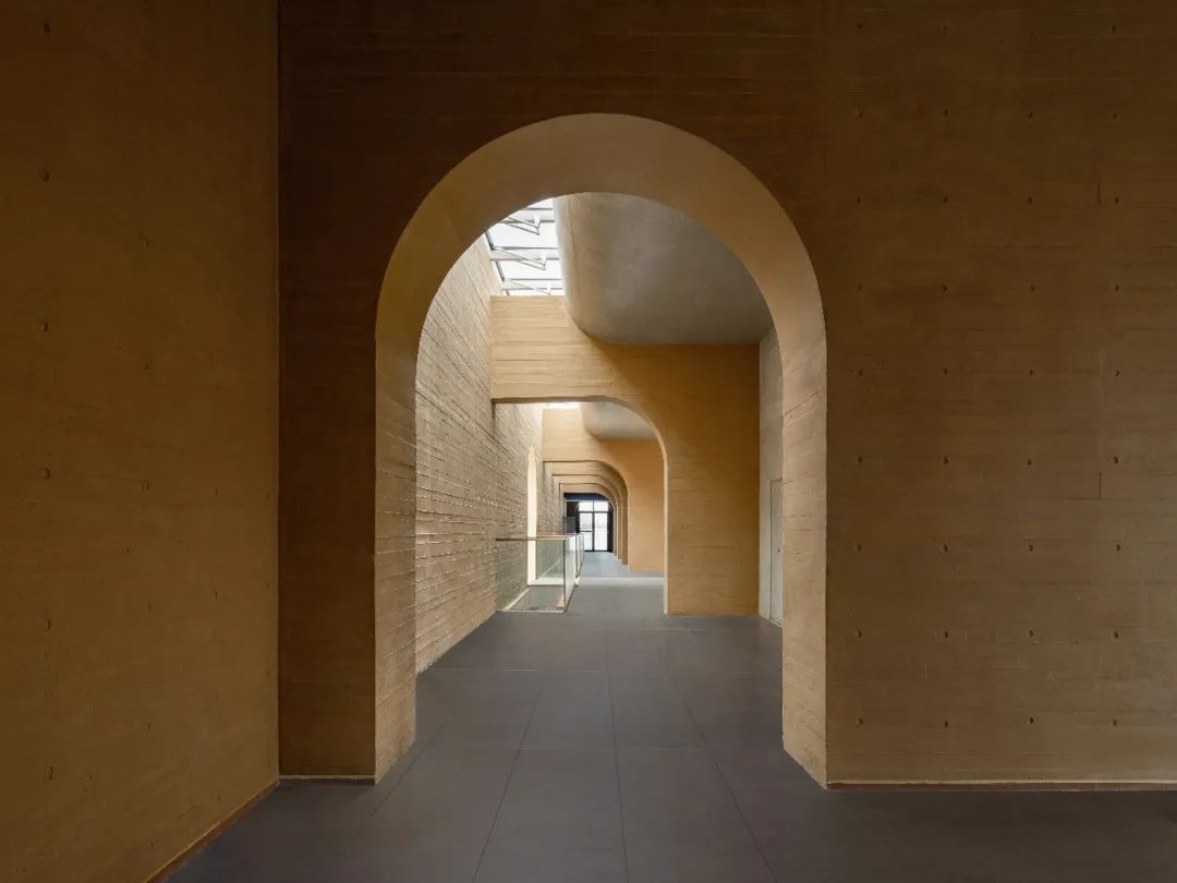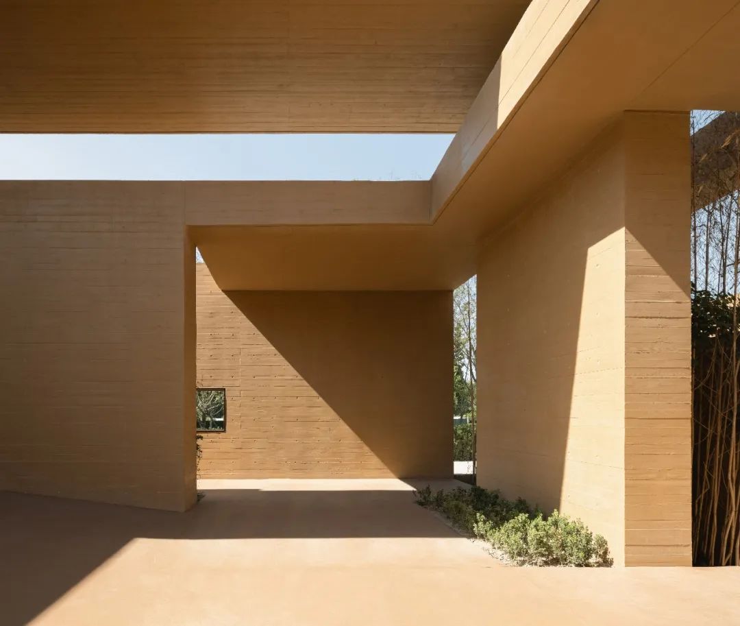因地制宜的下沉庭院,让建筑仿佛从自然中生长出来;采用黄土色清水混凝土保持与大地相似的色彩与质感,不冲击和破坏城市风景;还有极具东方韵味的架空“米纸灯笼”茶室、静水面、水楼梯和水面橙色玻璃亭为整个建筑增添了神秘色彩。
