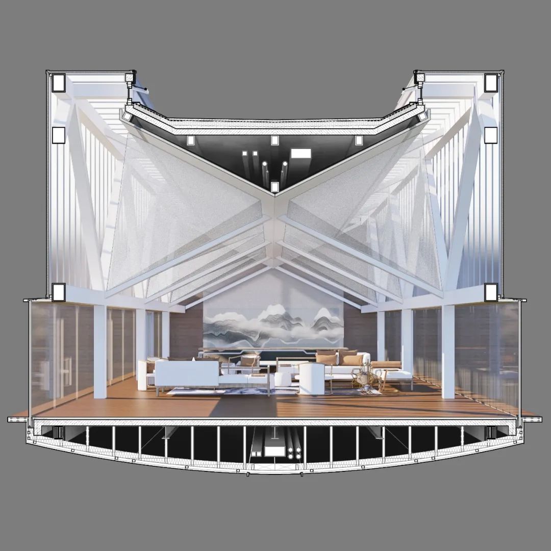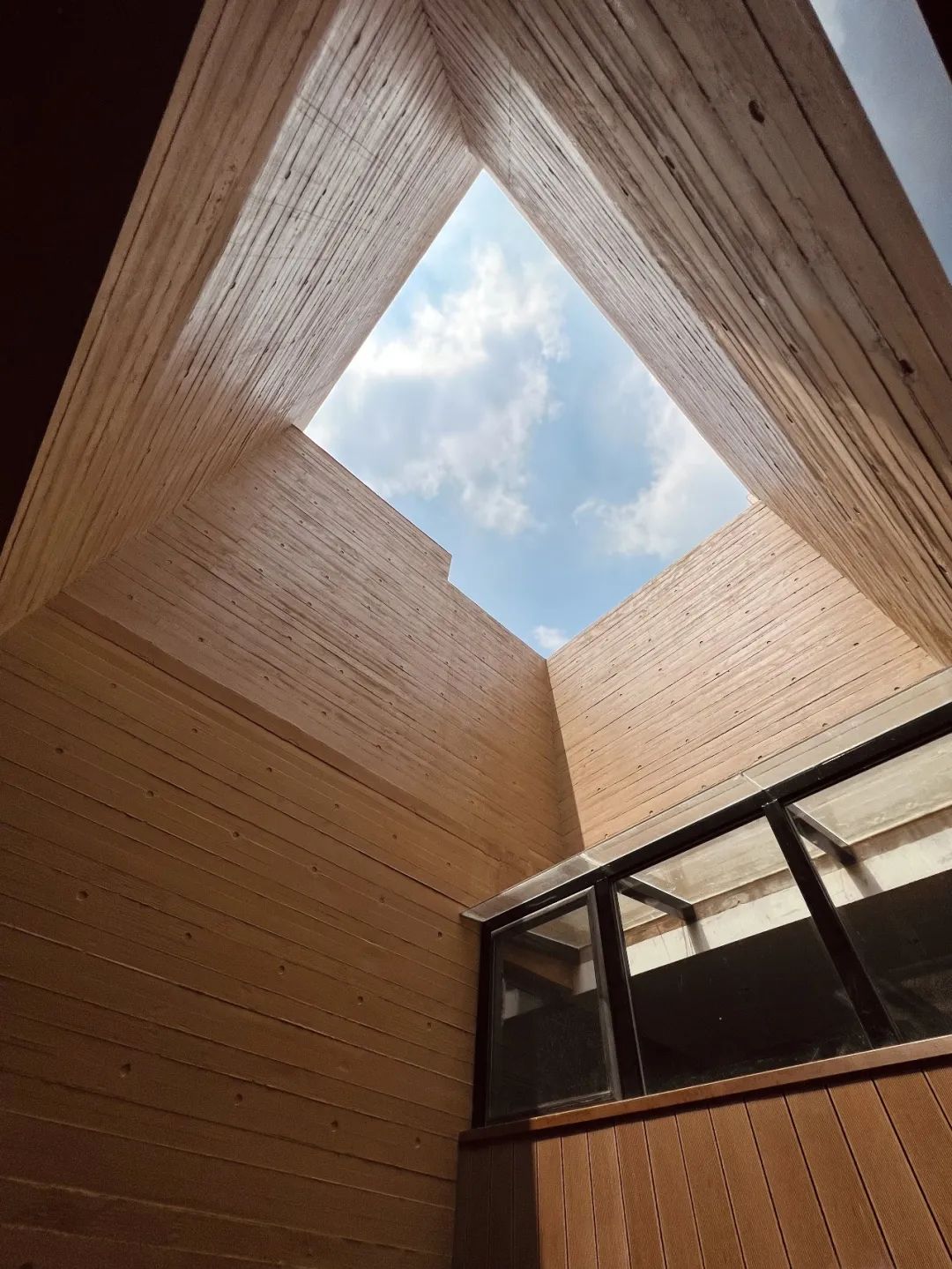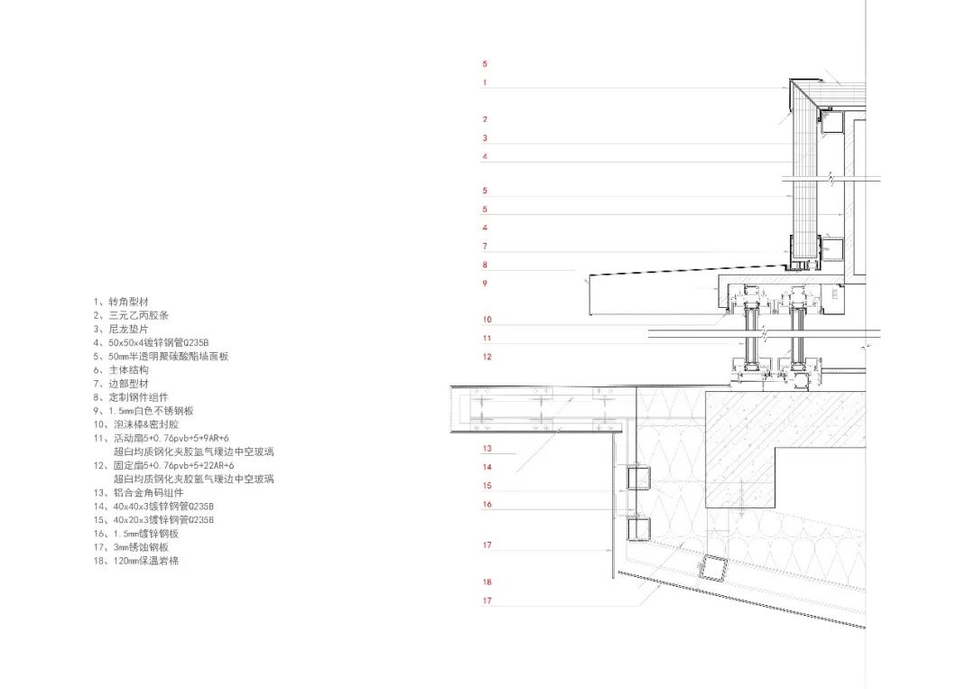 主要材料:黄土色木纹清水混凝土、耐候钢板、聚碳酸酯板、超白钢化夹胶玻璃做数码打印、极窄边框大型可移动门窗、温控可开启天窗系统、导光筒等