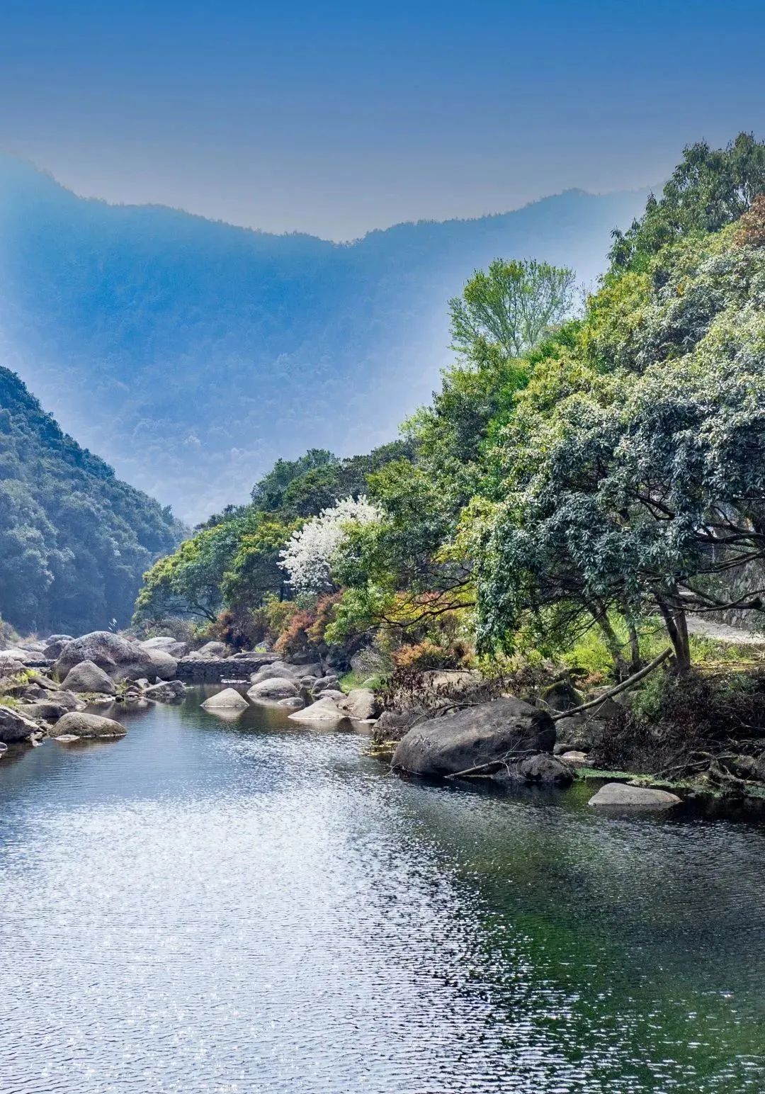 她就哪样山依偎着水,水映照着山,如缕缕飘带缠绕在绿水青山之中,成为一道独特的意境深远的风景。
