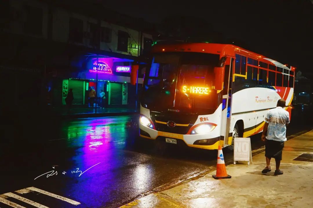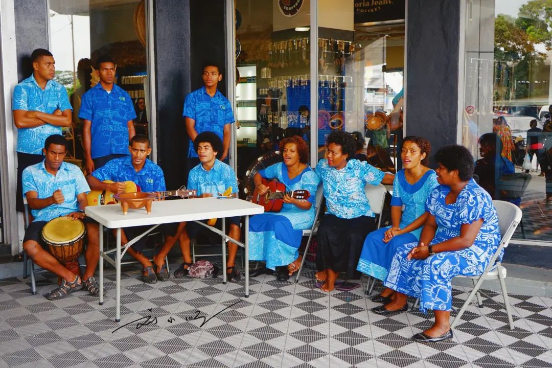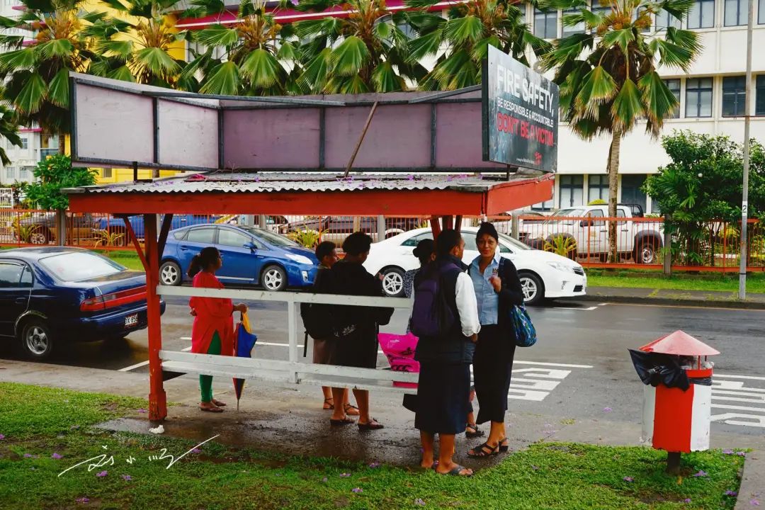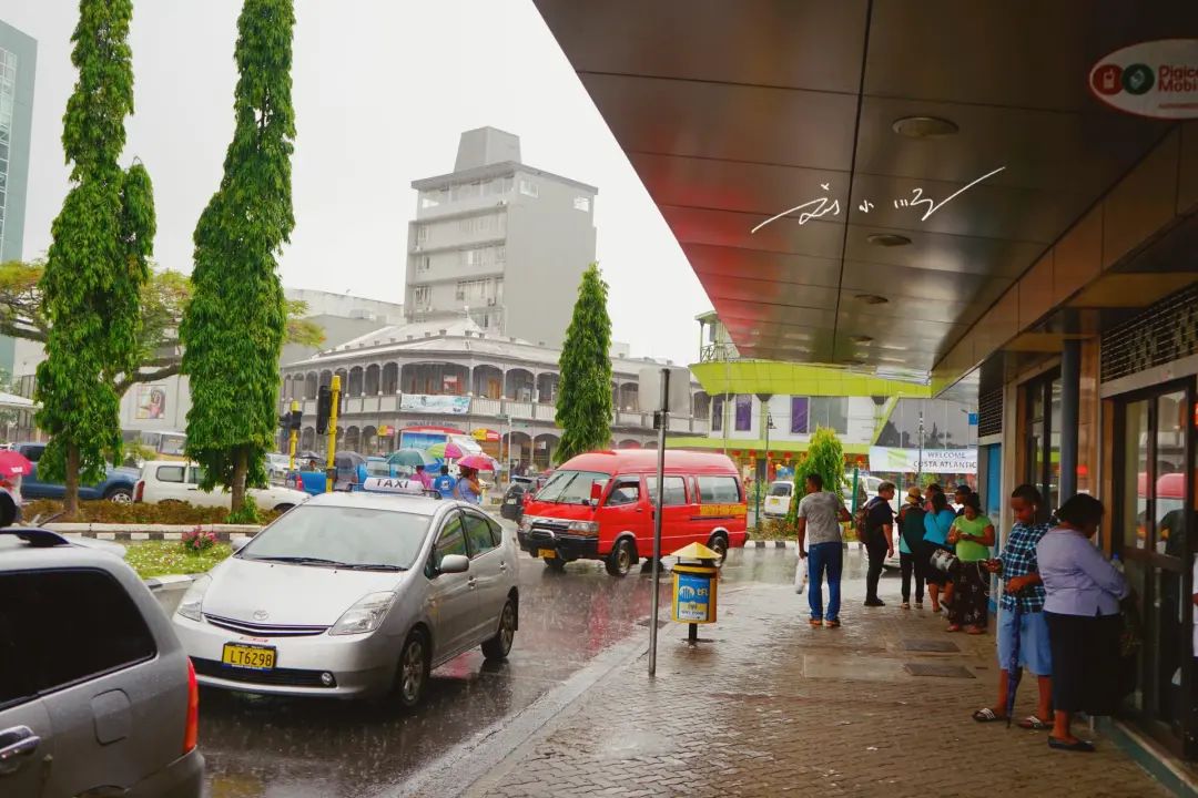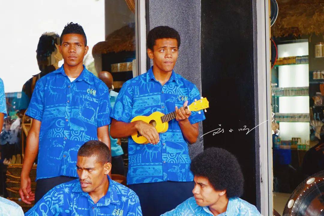 好在路边有个小乐队正在演出,乐队成员穿着带有当地特色图案的衣服,唱着很有斐济风味的歌曲,突然感觉躲雨都变得浪漫起来。