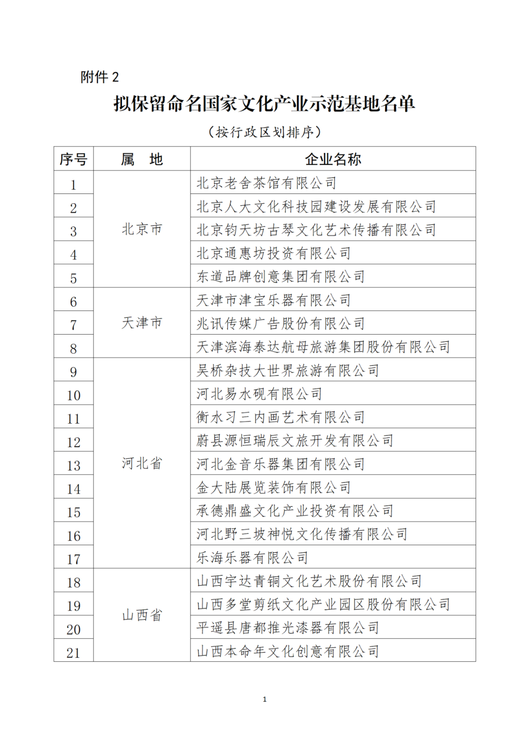 1. 新一批国家文化产业示范基地拟命名名单