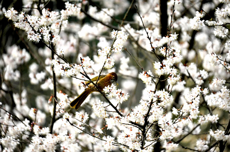 洁白似雪的李花簇簇怒放,在明媚阳光的照耀下,枝头李花随风摇曳生姿,似乎在向来人报春来。
