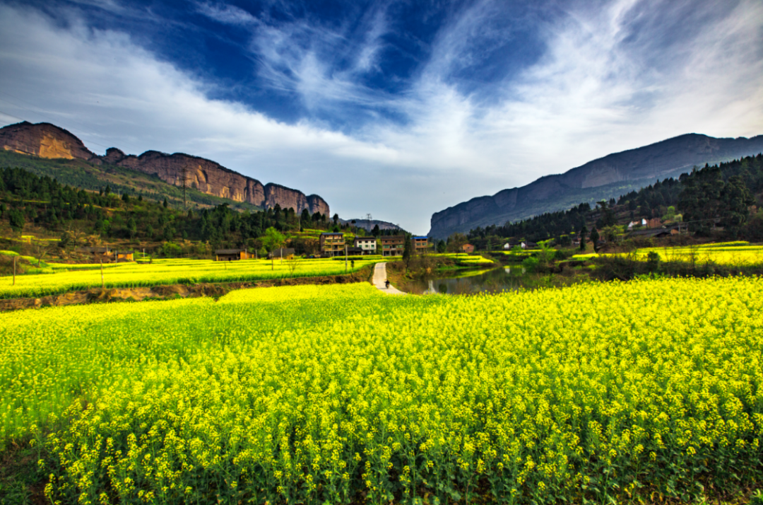 听水流潺潺、鸟鸣啾啾,剑山的雄奇险峻与油菜花的温柔美好总是相得益彰。