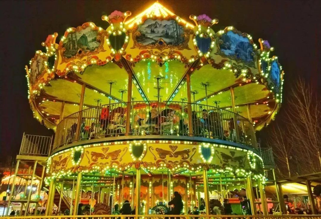 华盖覆顶,小马可爱,乘坐在色彩斑斓、富丽堂皇的木马上起伏旋转,置身仙境般的童话世界