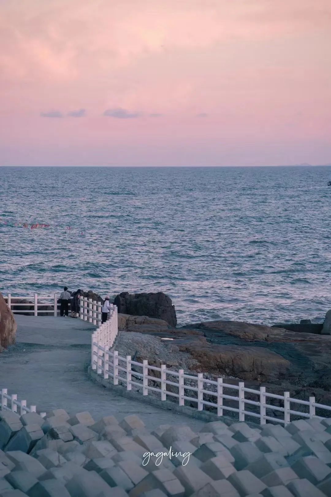 温柔的粉紫色天空倒映在海面,浪花层层堆叠,迎着风和爱的人携手漫步海岸,惬意又浪漫。