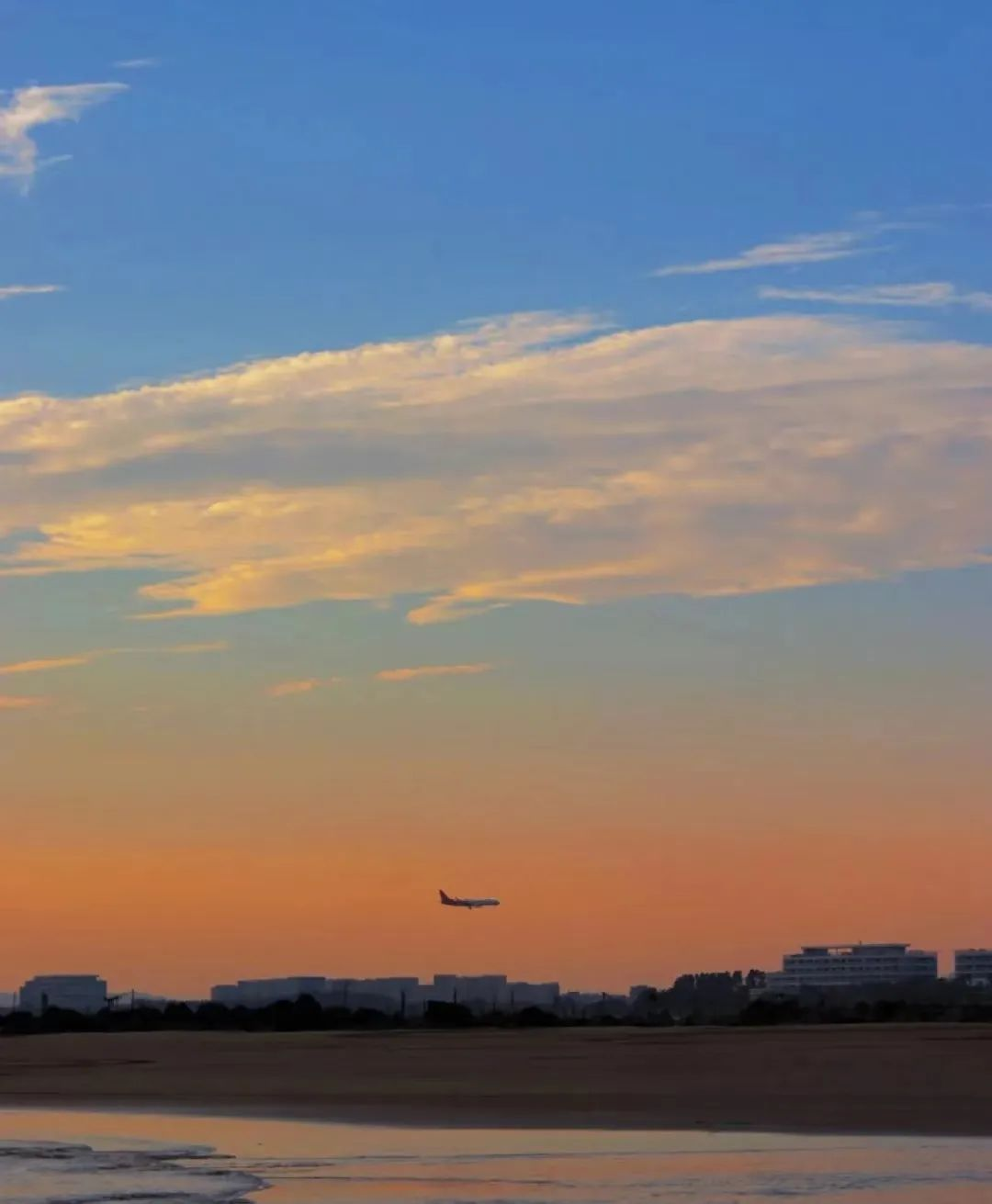 因为沙滩靠近机场,时不时有飞机低空飞过,瞅准时机,就能得到一张飞机合影照。