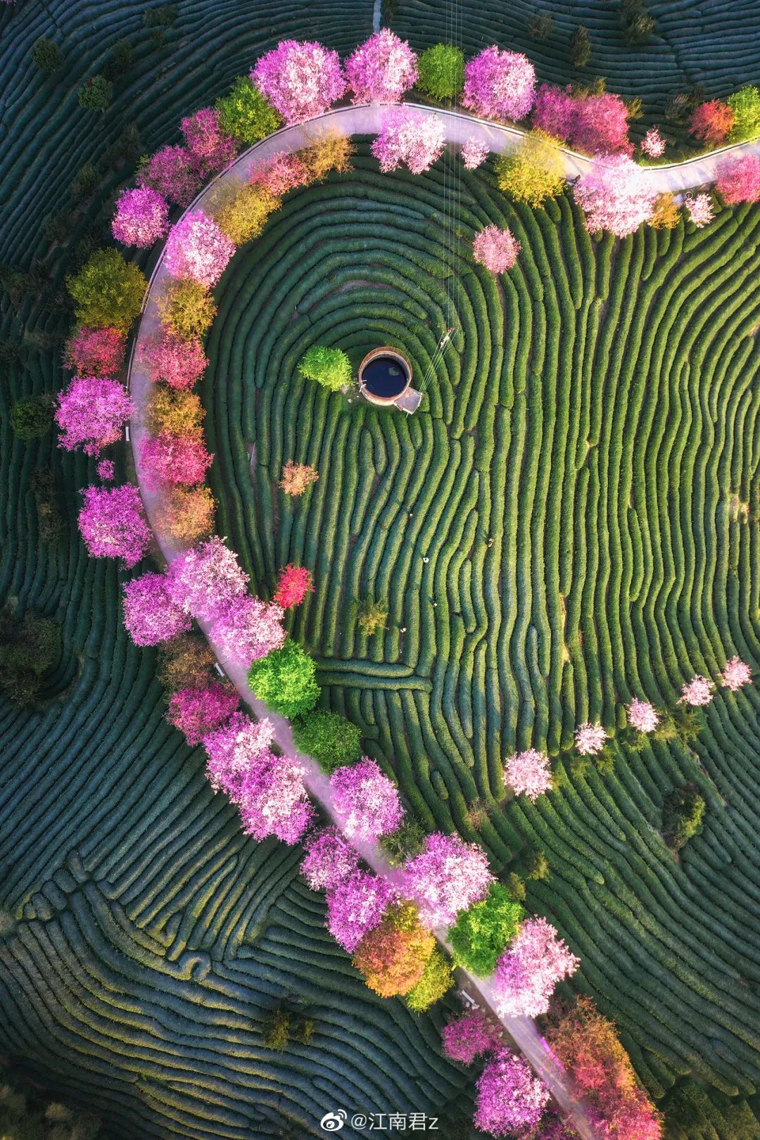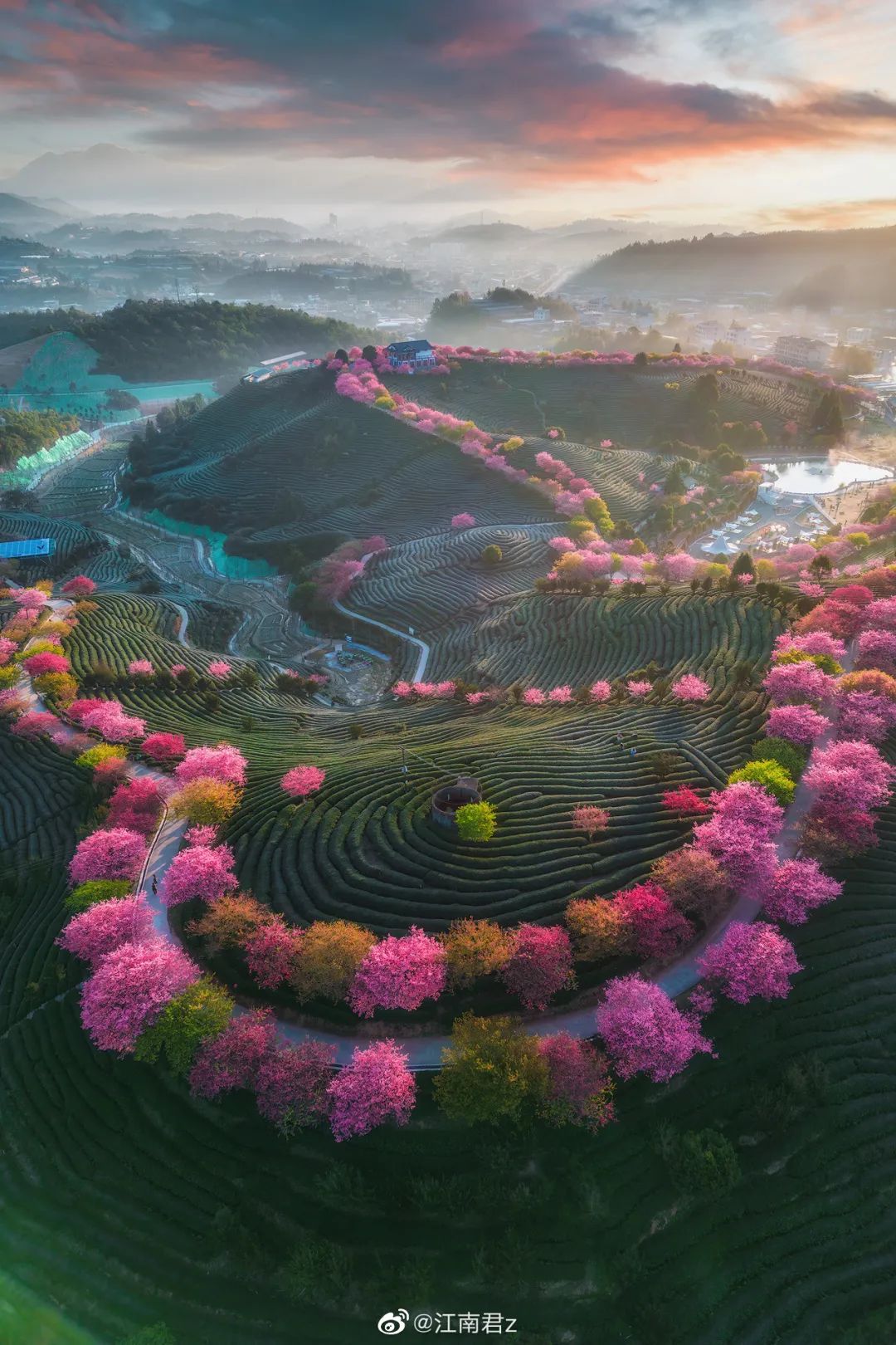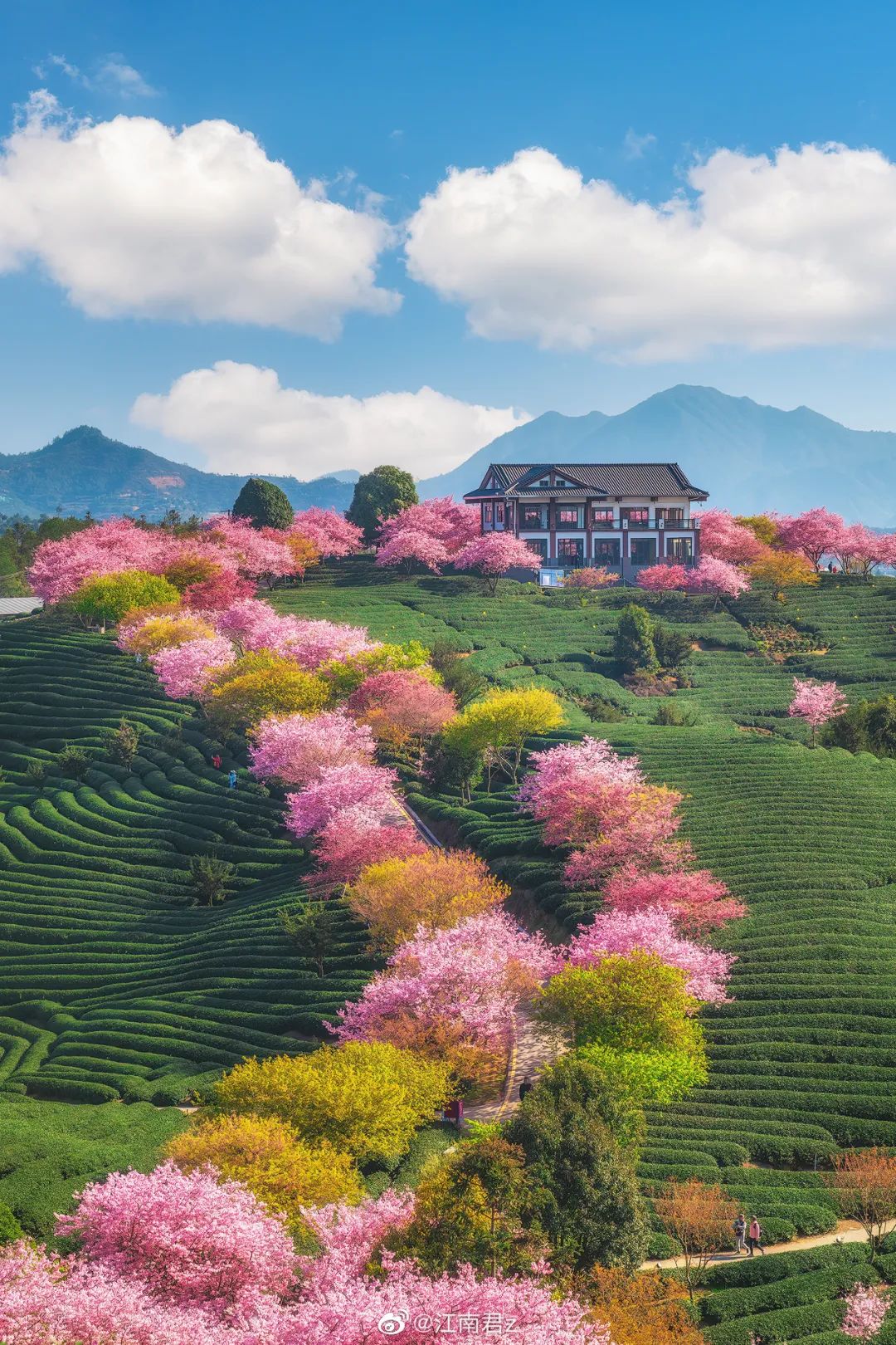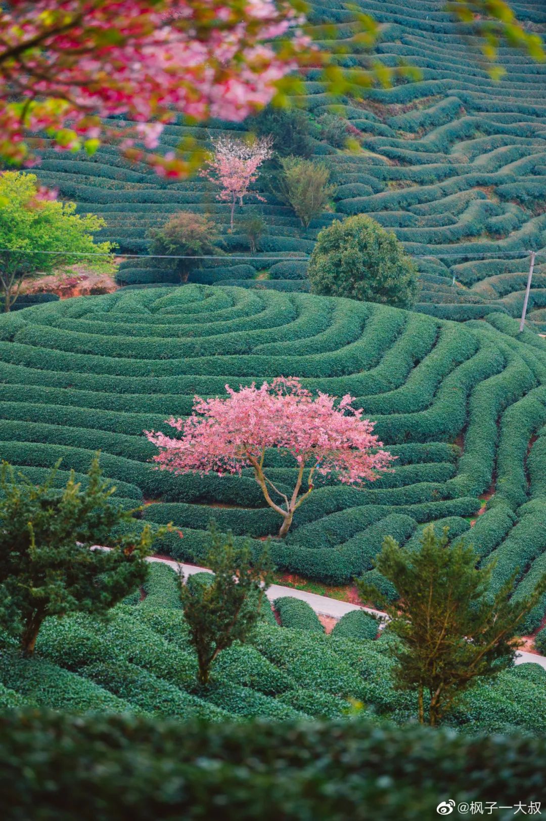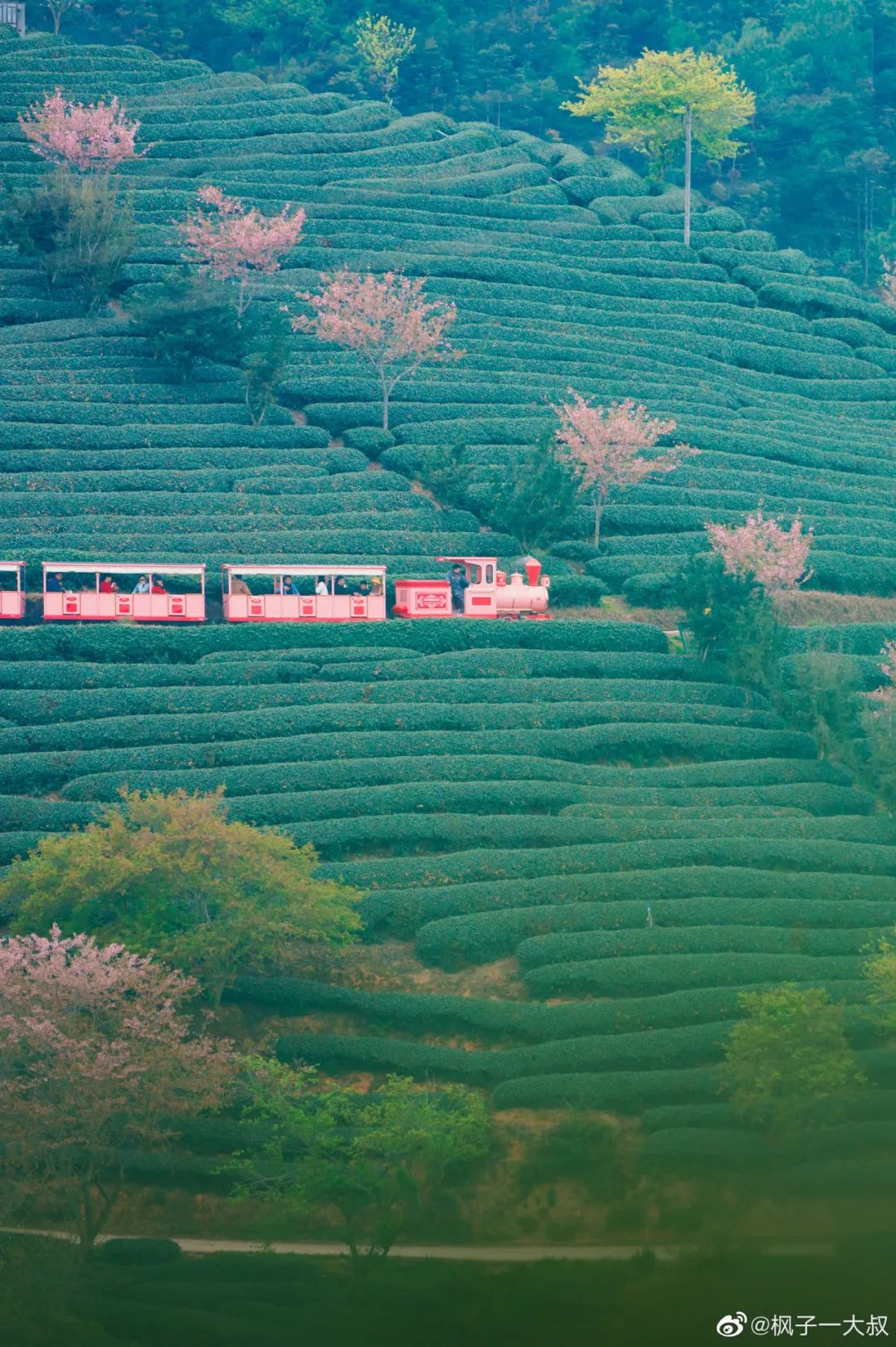 在每年1月下旬到3月中旬,5万亩的茶园内种植的10万株樱花,品种一个接着一个开放,茶绿樱红,真的超美耶!