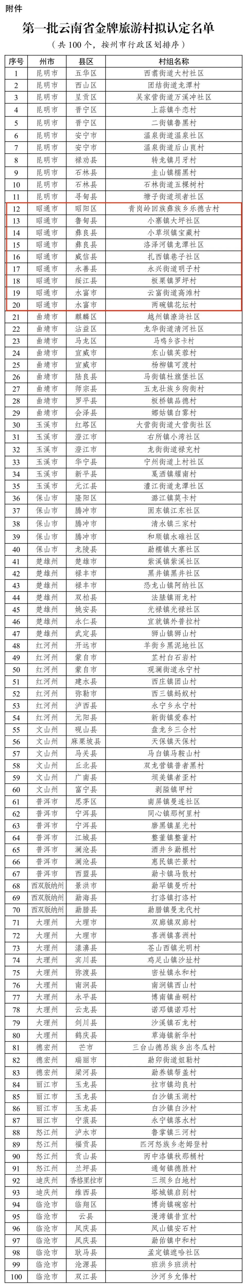 《关于第一批云南省金牌旅游村拟认定名单的公示》