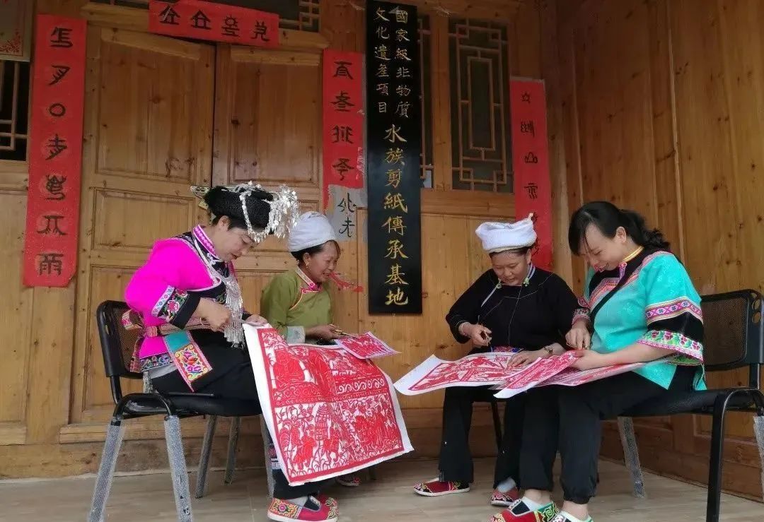 归兰水族乡潘硐村是全国第一个村级国家级非遗项目水族剪纸传承基地。水族剪纸是随着早期水族人民装饰需要而产生的,在水族古歌中有关于剪纸的叙述,水族墓碑石刻图案,后逐渐传承发展下来,其历史非常悠久。内容题材以水族人民生产生活场景为主,造型构图多为花草、鸟兽、人物,最直接地反映了水族人民对现实生活热爱和渴求生活美好和幸福的愿望。2009年,水族剪纸艺术被列入贵州省非物质文化遗产代表作名录;2014年11月,列入国家级非物质文化遗产代表性项目名录扩展项目名录。潘硐村也因有水族剪纸、水族文字(水书习俗)、水族端节等国家级非遗文化,以及都柳江水系源头之一归兰山景区等资源优势,有“全省乡村旅游重点村”之称。