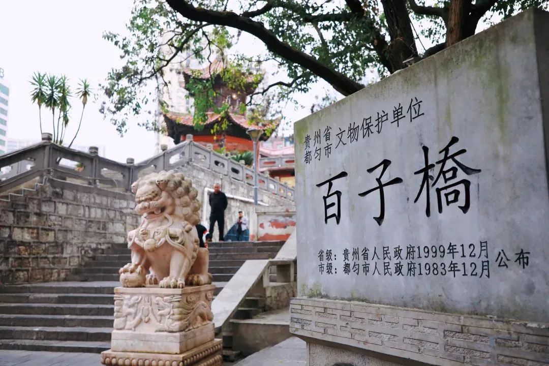 这座古色古香的桥梁曾是都匀市区内交通流量最大的一座桥梁,贵州的第一条公路就从此桥上穿梭而过,于1999年被省人民政府公布为省级文物保护单位,是都匀市最重要的地标建筑之一,始建于清代乾隆五十一年(公元1786年)。当年,家境殷实的乡绅唐文升年过半百无子,又深谙剑江两岸父老乡亲往来之艰辛,行商作贾交易之繁琐,毅然决然修建横跨剑江南北的一座大桥。历时五载,桥梁终于落成,取名“百子”,意为多子荫福。现仍有不少人会在桥上取一盏毛尖,望着江景,想起书中的故事:“古有乡贤,年过半百无子”“故建桥求子,得偿所愿”。