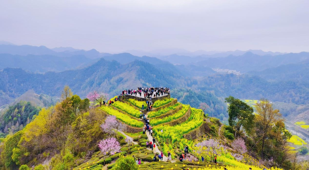被评为“中国最美田园”的梅干岭梯田,是绝佳的春日取景地。大片的油菜花就着地形,从山脚蔓延到山腰,拼出独属于家朋的春韵。