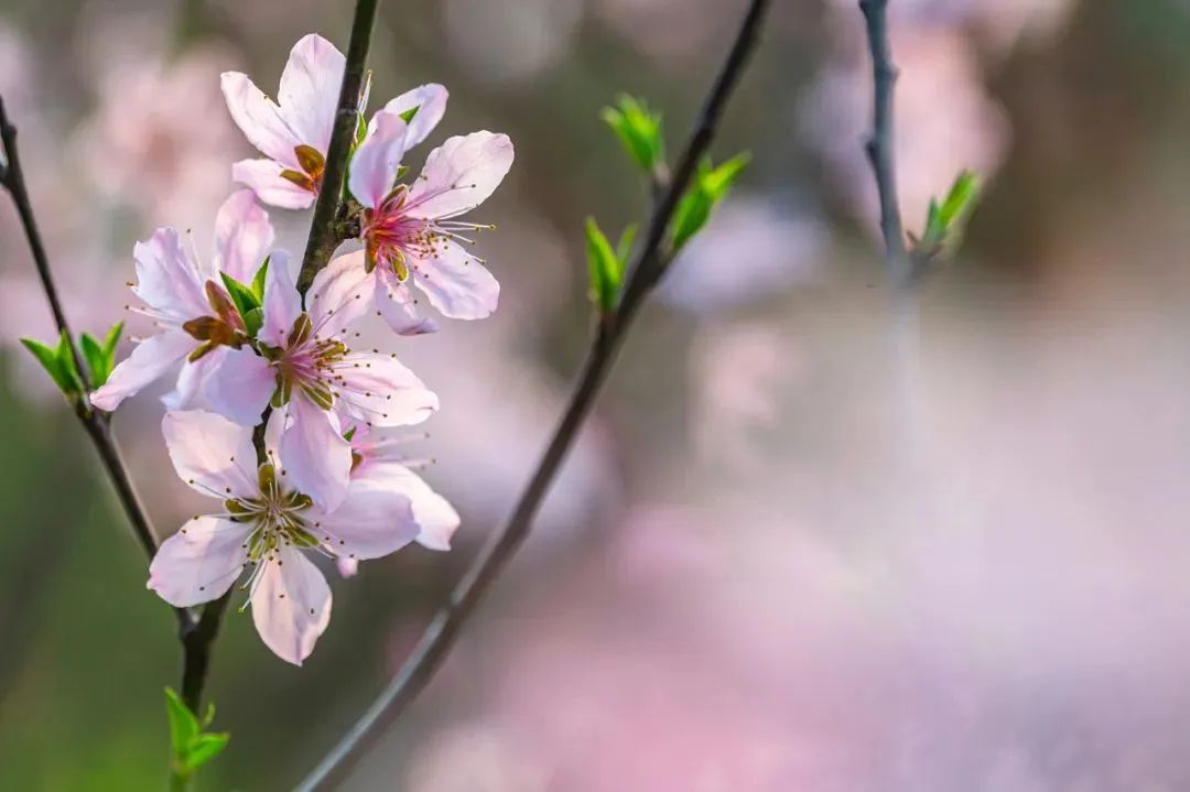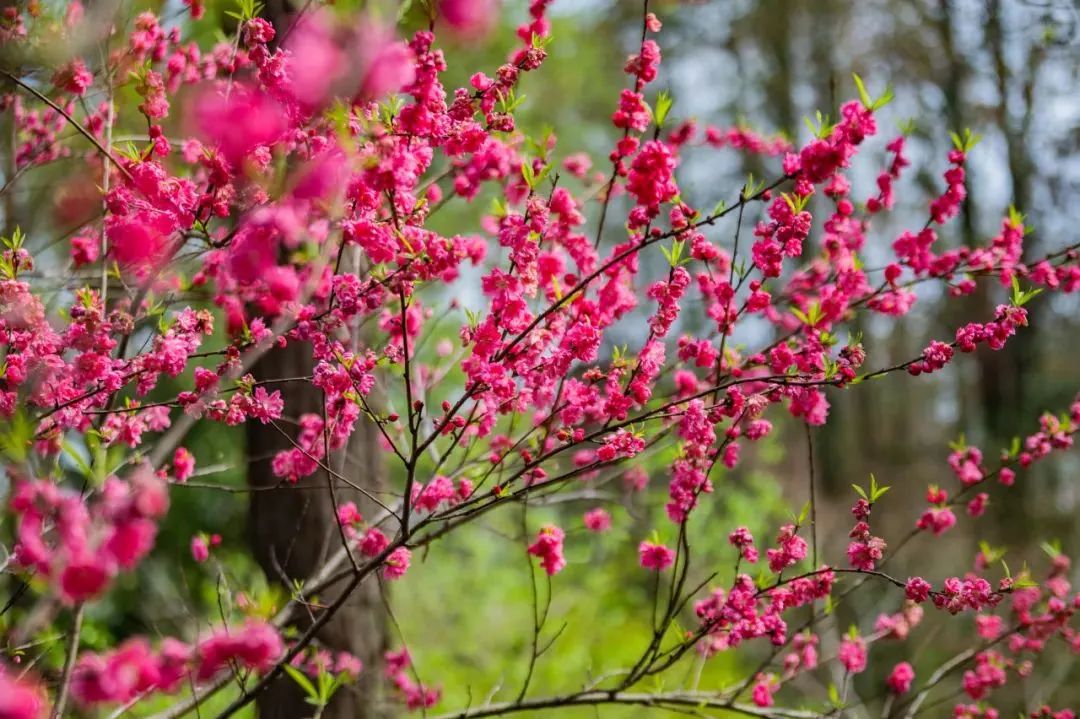 桃花树态优美,枝干扶疏,花朵丰腴,色彩艳丽,每至三月,满园桃花灿若红霞,让人沉醉。