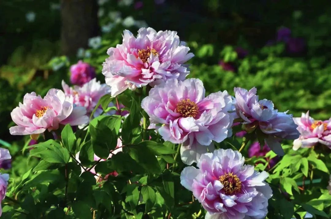 嫣红、玫红、浅粉、黛紫、乌墨、明黄、玉白、豆绿、粉蓝、复色,各色牡丹将姹紫嫣红开遍,风姿绰约、国色天香。