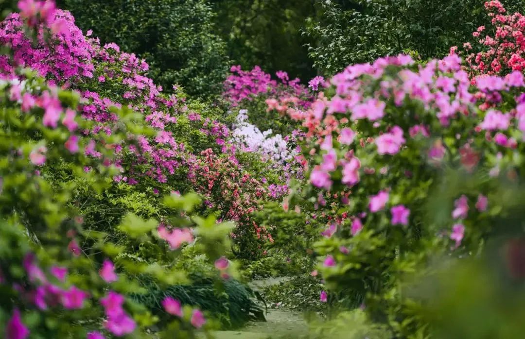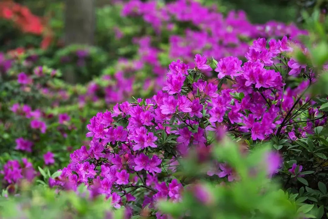 人间四月,山花烂漫,园内各处杜鹃簇拥枝头,织锦堆绣,漫山红遍,美不胜收。