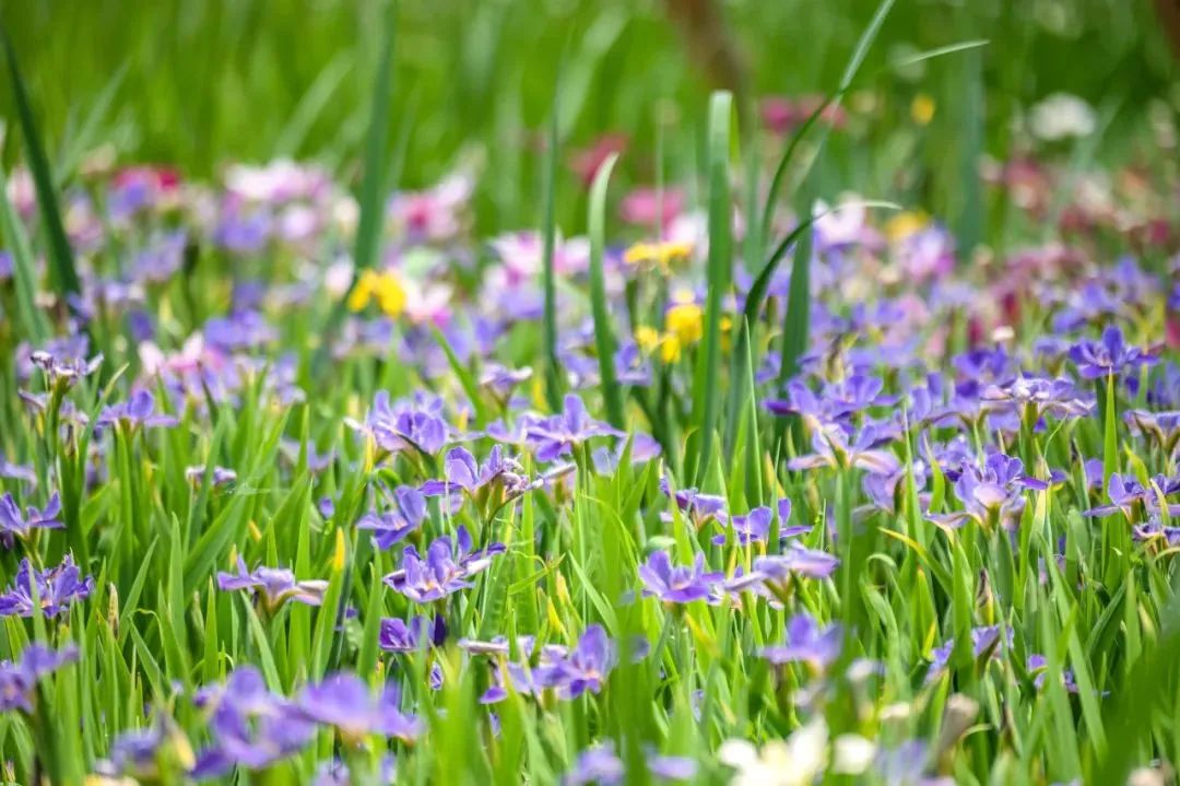 5月,在武汉植物园的鸢尾展示区及很多路边都可以见到鸢尾花,这里的鸢尾花有蓝、紫、黄、白等色,花型大而美丽。
