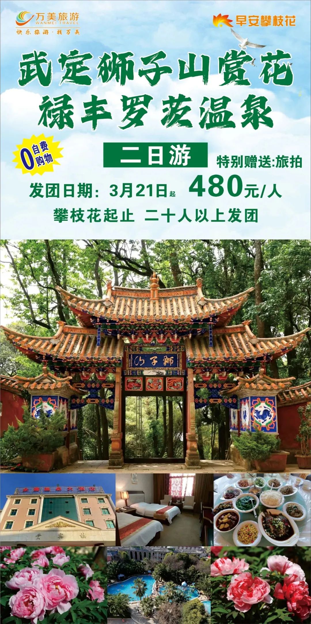 早餐后乘汽车前往【武定狮子山】景区观赏牡丹,AAAA级旅游景区武定狮子山与县城紧密相连,是一个融自然景观和人文景观为一体的景区。狮子山景区自然景观丰富独特,以“雄、奇、险、秀”著称;佛教文化、牡丹文化、帝王文化、民族文化多元文化共荣,底蕴深厚,有明朝第二代皇帝建文帝“靖难之役”后隐居狮子山为僧的遗迹,有集儒、释、道和皇宫为一体的正续禅寺。从明朝第二代皇帝建文帝在狮子山出家为僧,栽下第一株牡丹起,武定就与牡丹花结下了不解之缘。用完午餐乘车返回攀枝花,结束愉快旅程!!!