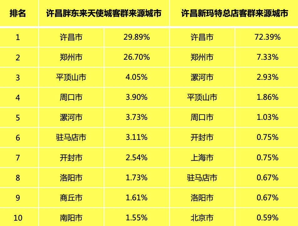 2、通过对比可以发现,胖东来天使城本市客群占比从39%下降到29.89%,正是郑州客群从16%增长到26%。连带着新玛特总店本市客群占比也下降了,可见胖东来吸引来了外地客群,但获益的是整个城市,类似情况可以参考去年淄博爆火时小编撰写的文章《进淄赶烤,成绩几何?》