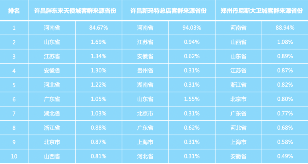 2、它的许昌市外的外地客群达到了60%,河南省外的外地客群达到了16%,如果对这个数字没有概念的话,我们可以和其他商场进行下比较,新玛特总店是许昌比较有规模的百货商场,丹尼斯大卫城是郑州最具代表性的高端商场。通过对比发现胖东来天使城市外和省外客群比例是最高的。