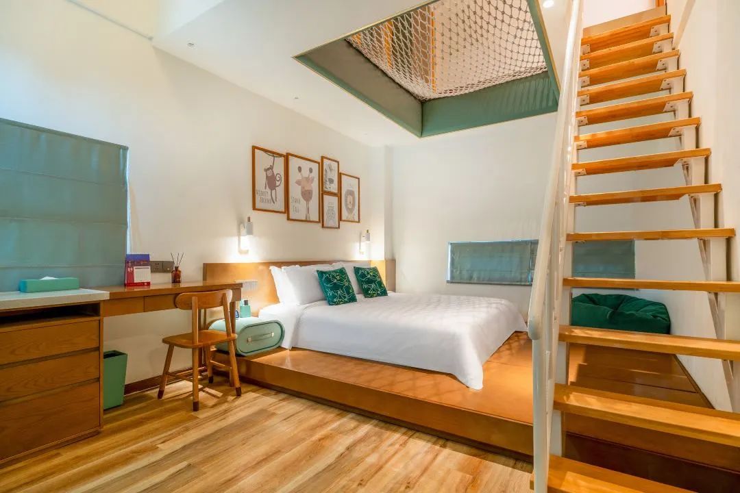 拾柒隐17栋别墅散落在小河两岸,一侧是“隐悦”私汤房,一侧是“隐趣”亲子房。隐趣系列有24间不同主题的亲子房,色彩鲜明的插画、各式各样的隐藏空间,充分满足孩子们的好奇与好动。