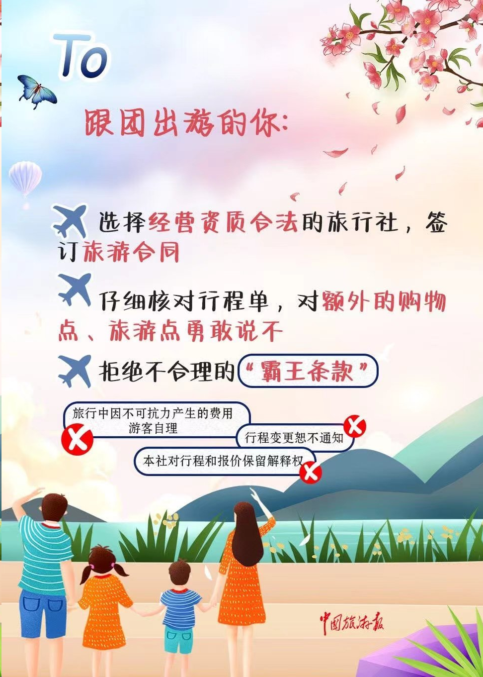 线下旅游跟团服务时,要先了解旅行社的旅游资质,出游前必须要签订合同、购买相关保险,认真通读合同条款,存疑时向工作人员咨询,留好纸质合同。