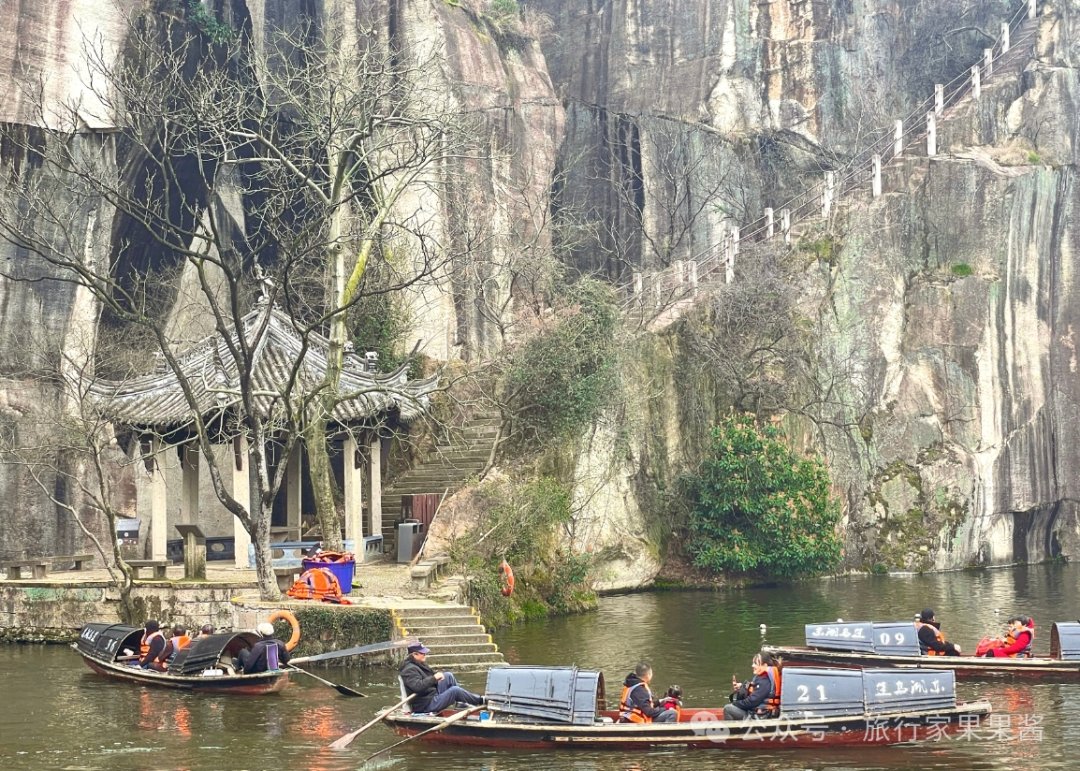 第一次来玩的小伙伴,建议进入景点后,先乘坐乌篷船,在崖壁之下感受东湖。最奇妙的是近观陶公洞与仙桃洞,乌篷船在进入的时候,仅容一艘小舟通行,缓慢前行后,里面别有洞天,豁然开朗,有坐井观天的意境悠然在目。