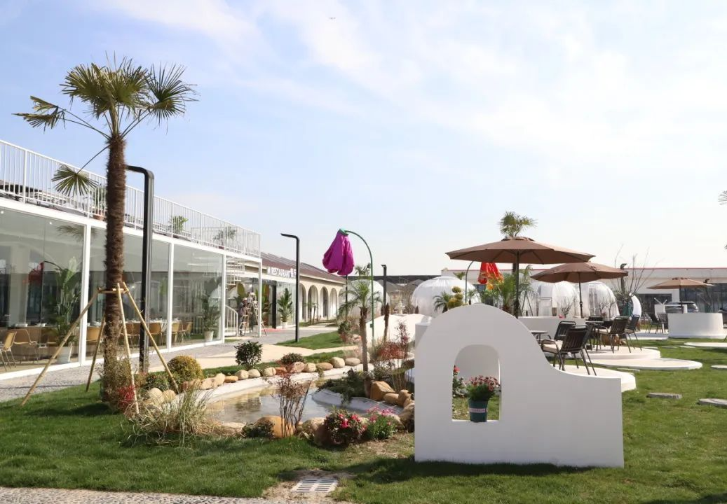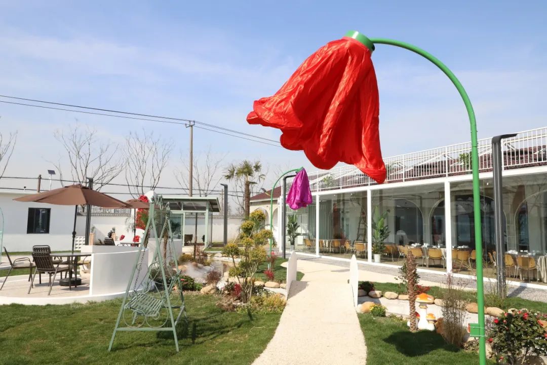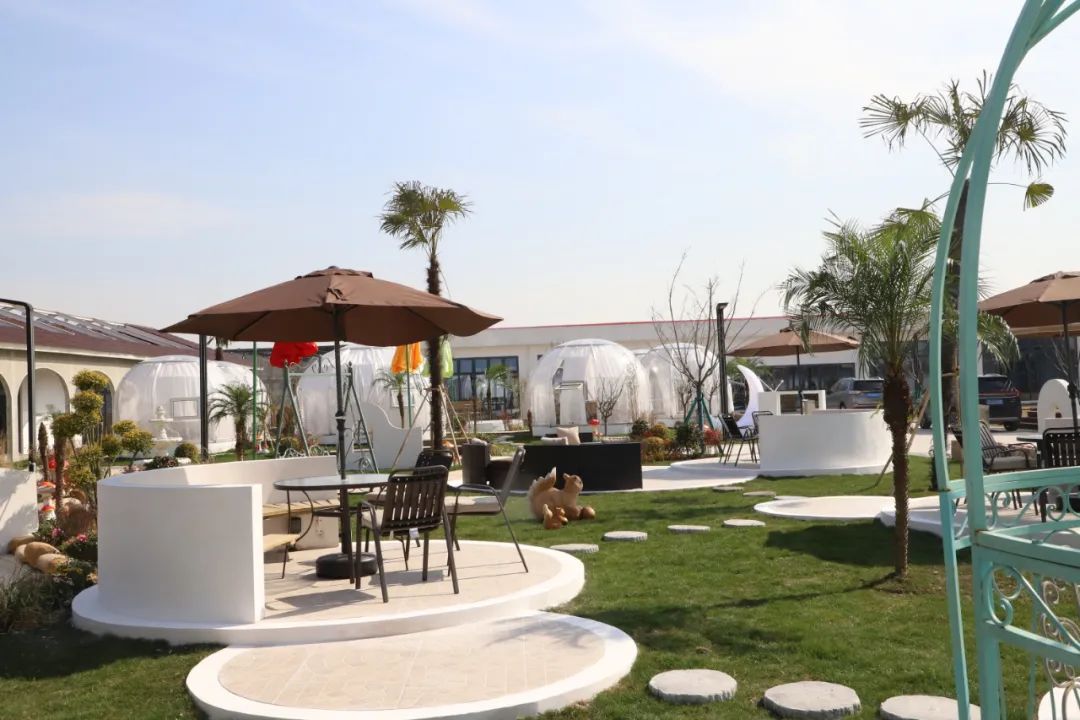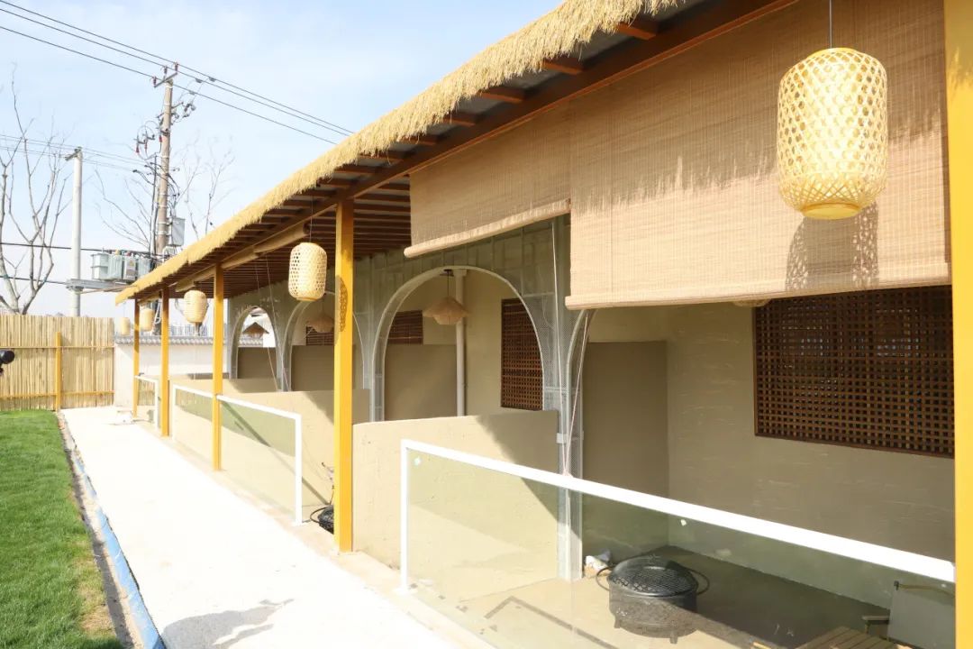 儿童游乐区里,滑梯、秋千、沙池、摇摇乐、科普角一应俱全,适合带娃“放电”。而在另一边的露营烧烤区,阳光洒在农家的草棚上,竹制的灯笼随风摇摆,隔着一席竹帘,随风声,伴花香,约上三五好友围炉煮茶,颇有些“偷得浮生半日闲”的舒适感。