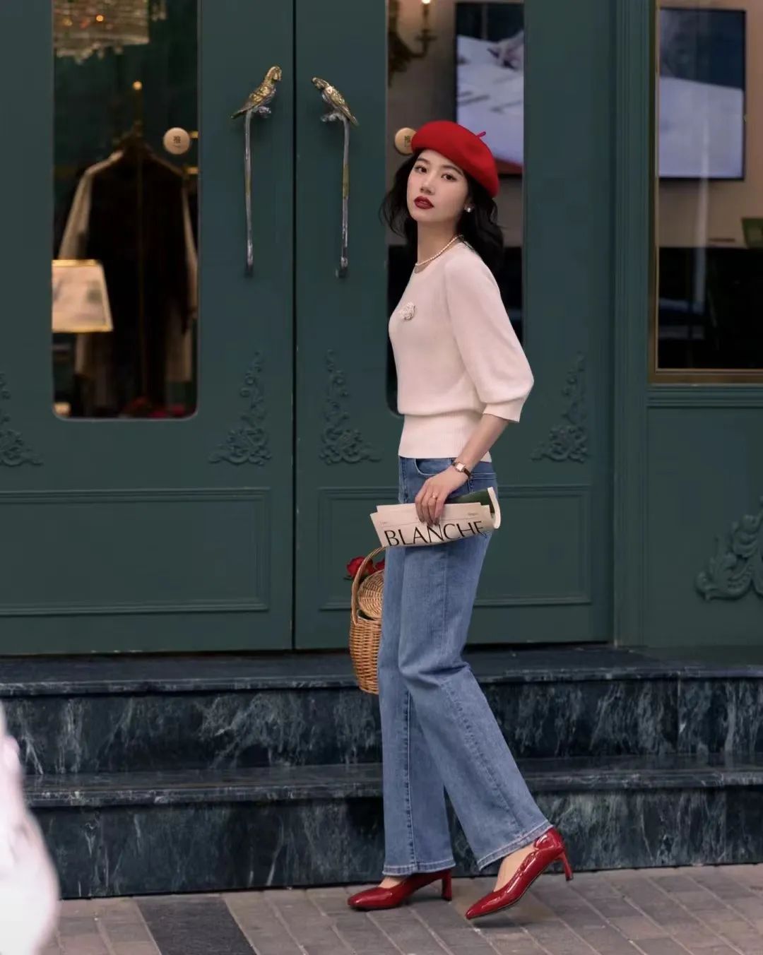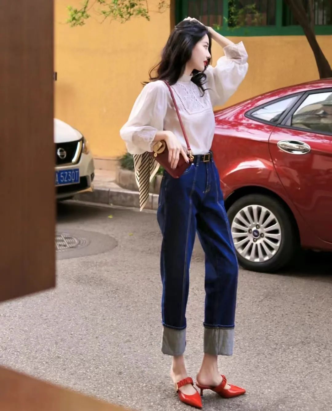 红色猫跟鞋+牛仔裤
