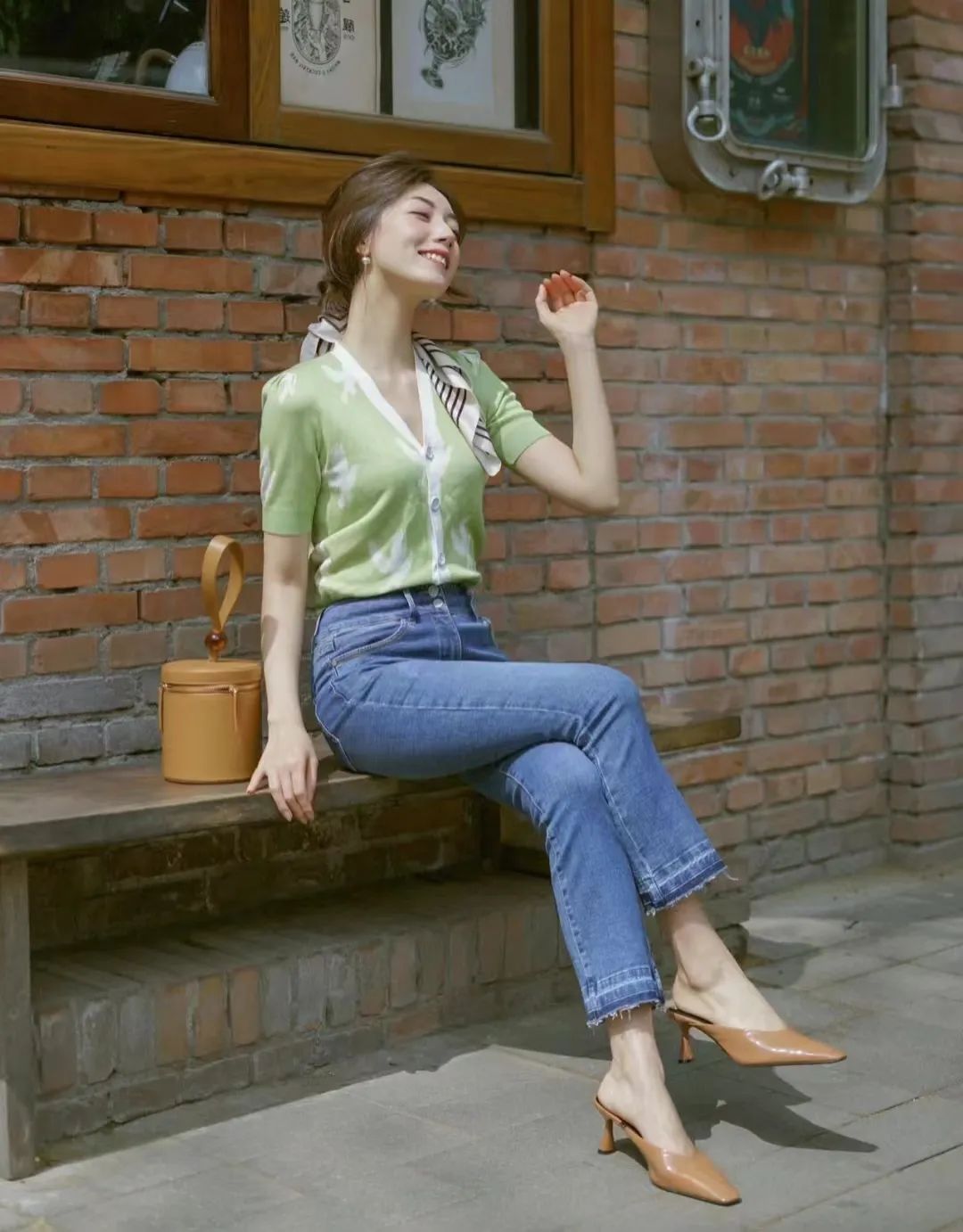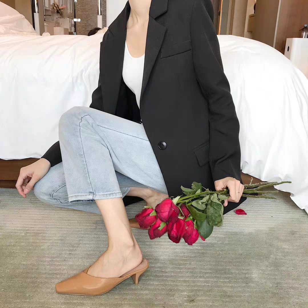 棕色包头鞋+牛仔裤