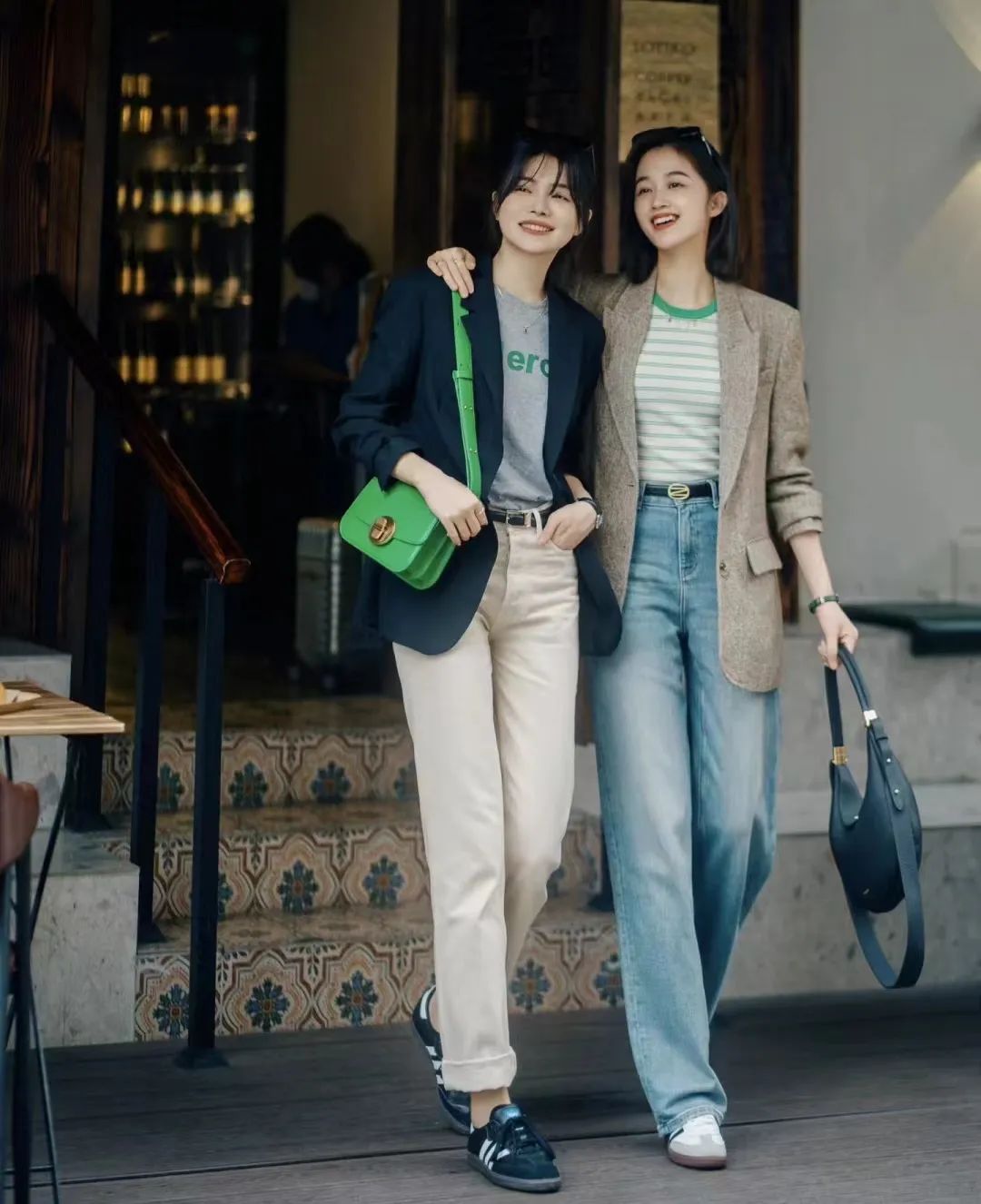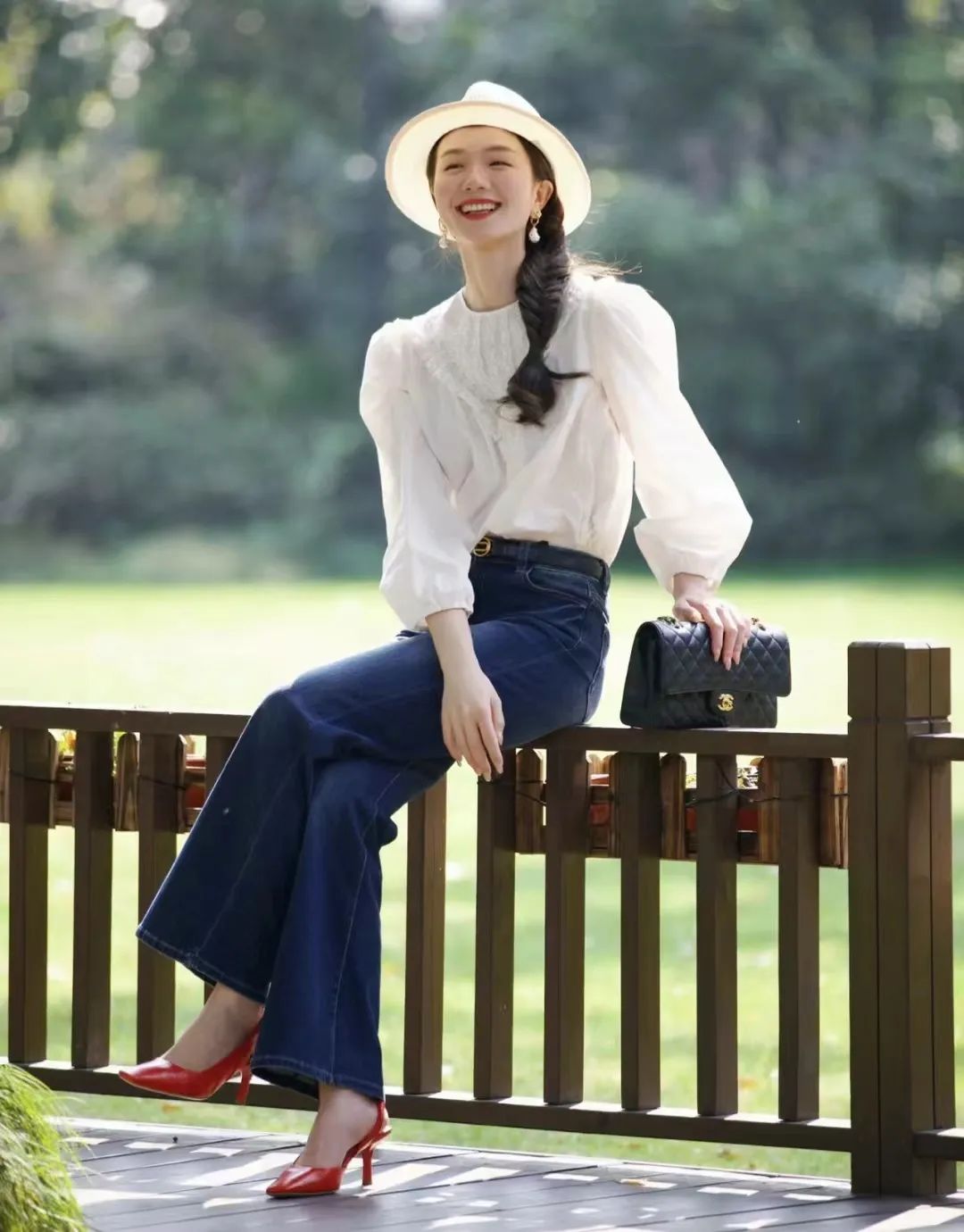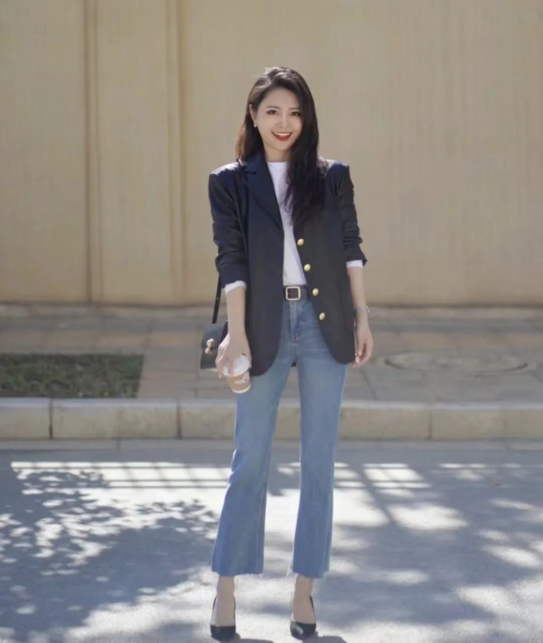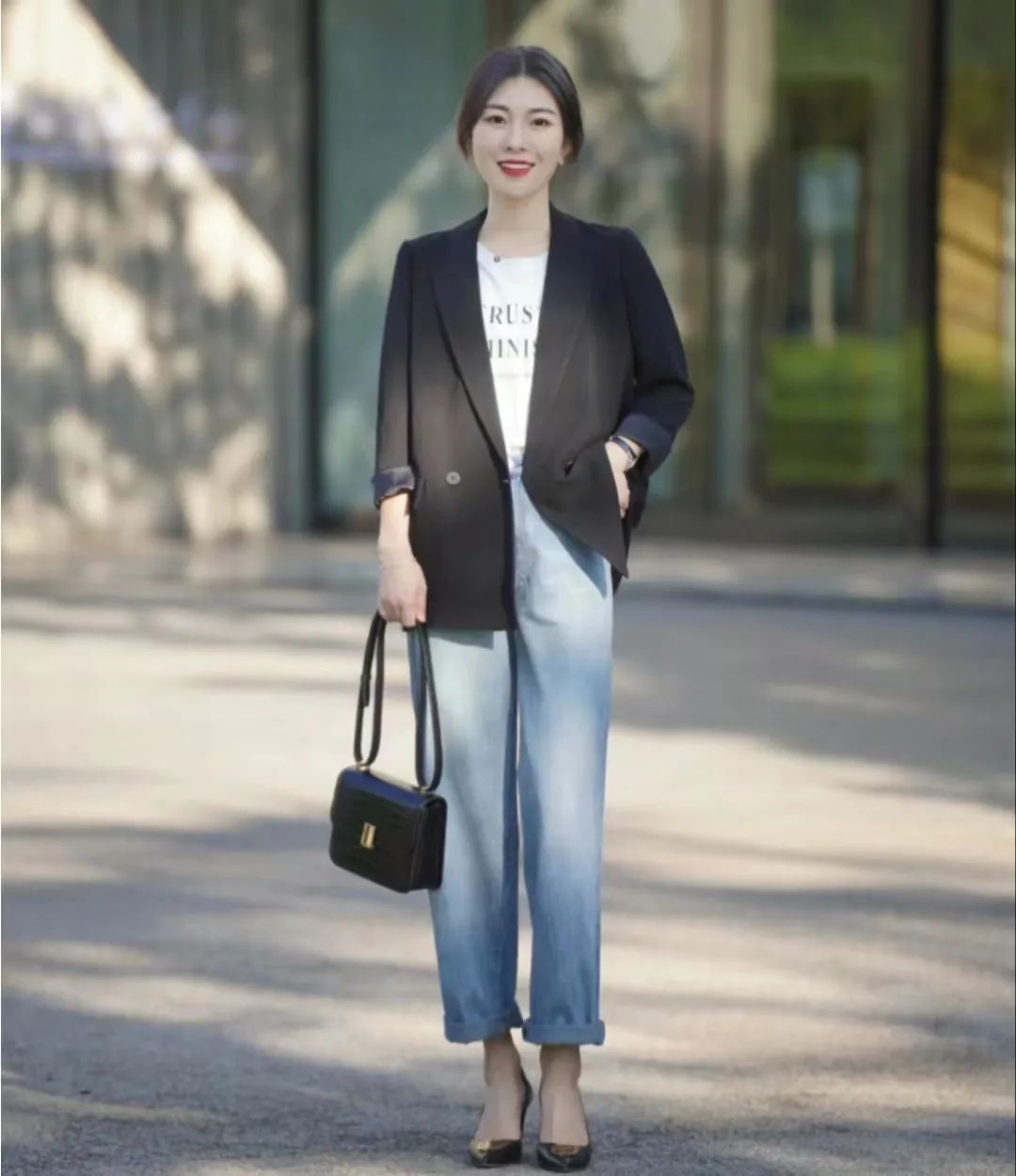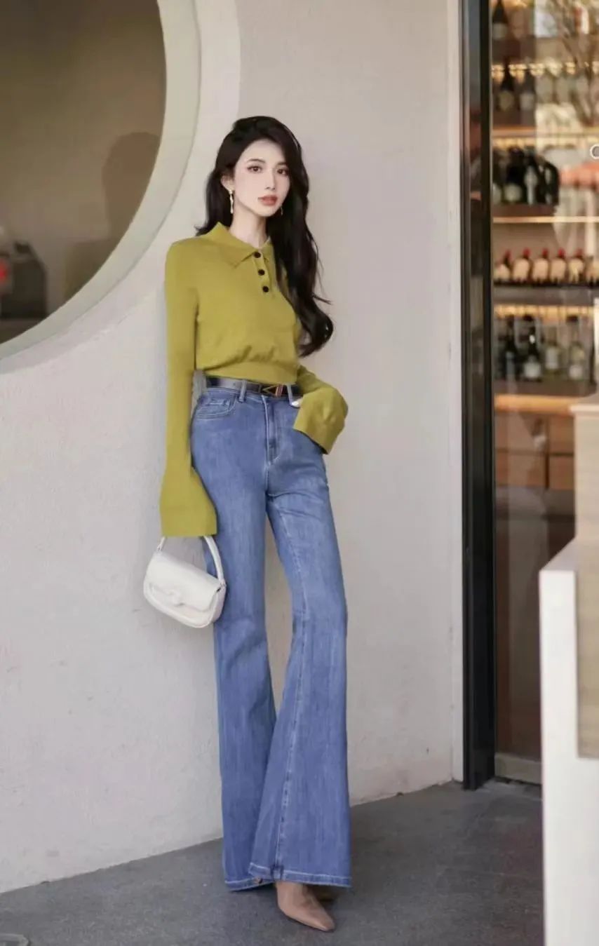 牛仔裤以其随性与休闲为特点,展现知性女性随性的一面,而高跟鞋则通过其优雅、挺拔的特质,展现出女性的成熟与妩媚。这两种截然不同的风格在搭配中相互交融,形成了一种独特的气质感,既展现出随性与知性并存的魅力,又能够通过高跟鞋的提升身高和塑造优雅形象,使整体造型更具时尚感。