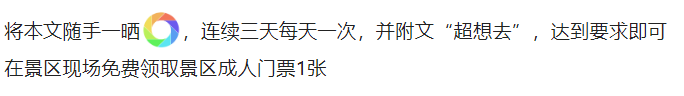 2、免费领票日期:2024年3月20日-2024年4月20日每天上午9:00-10:00(限此时间段内,过期无效)到景区换票处,把手机记录页面给兑票窗口工作人员看即可获得成人门票一张,仅限成人使用。