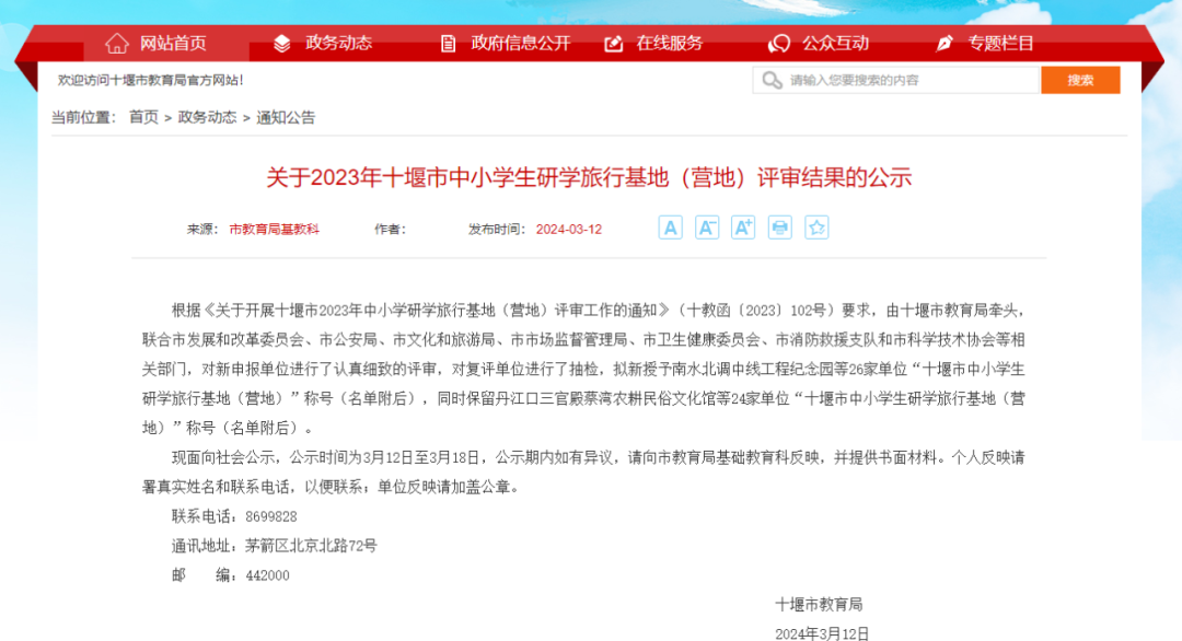 关于2023年十堰市中小学生研学旅行基地(营地)评审结果的公示