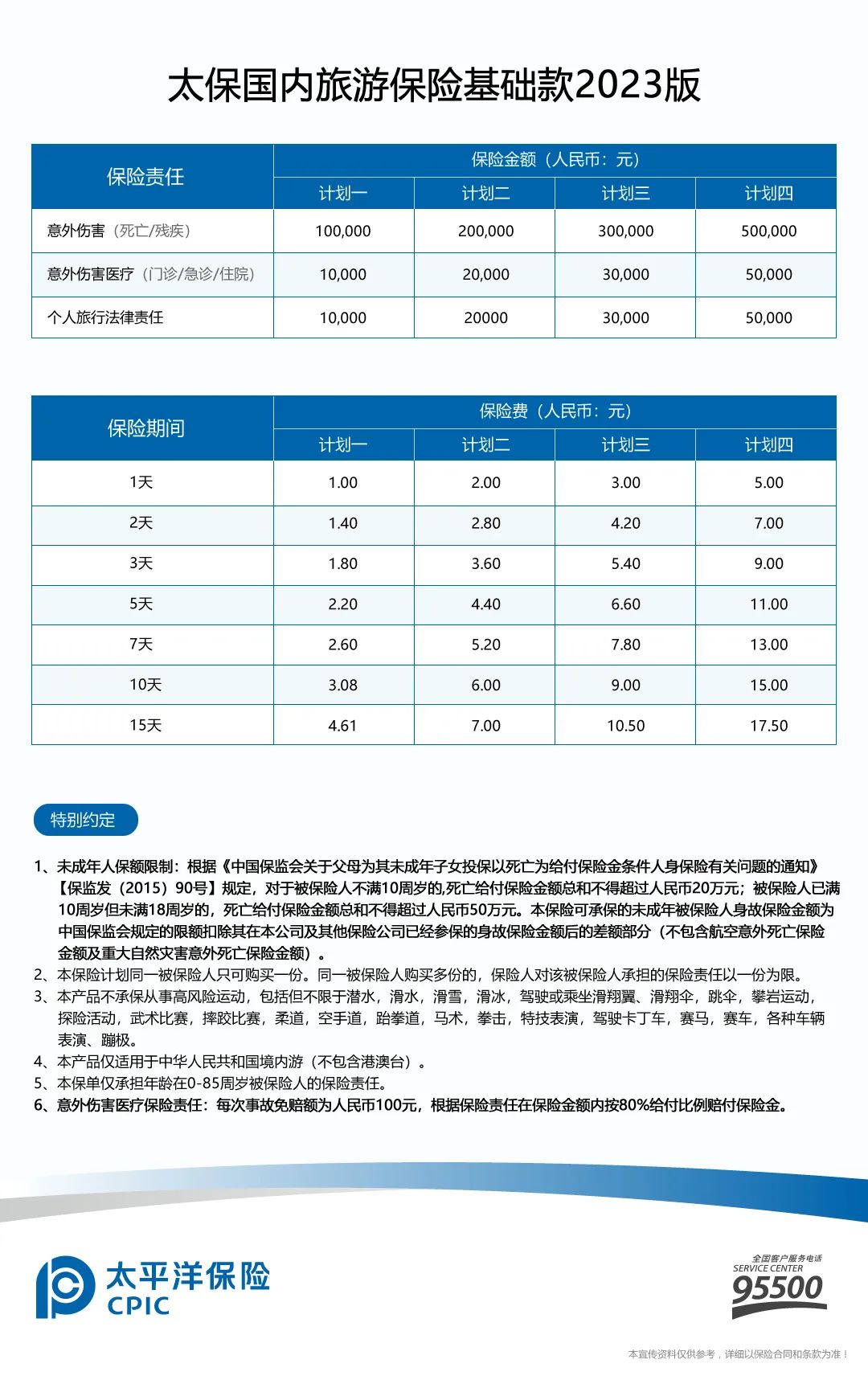 本产品仅适用于中华人民共和国境内游(不包含港澳台)。作为知名保险公司推出的险种,太平洋的旅游保险可以给游客提供全方位的保障,包括意外伤残、意外身故等,同时它的保费也比较便宜,一天只需几元或是几十元,便可让自己放心游玩。