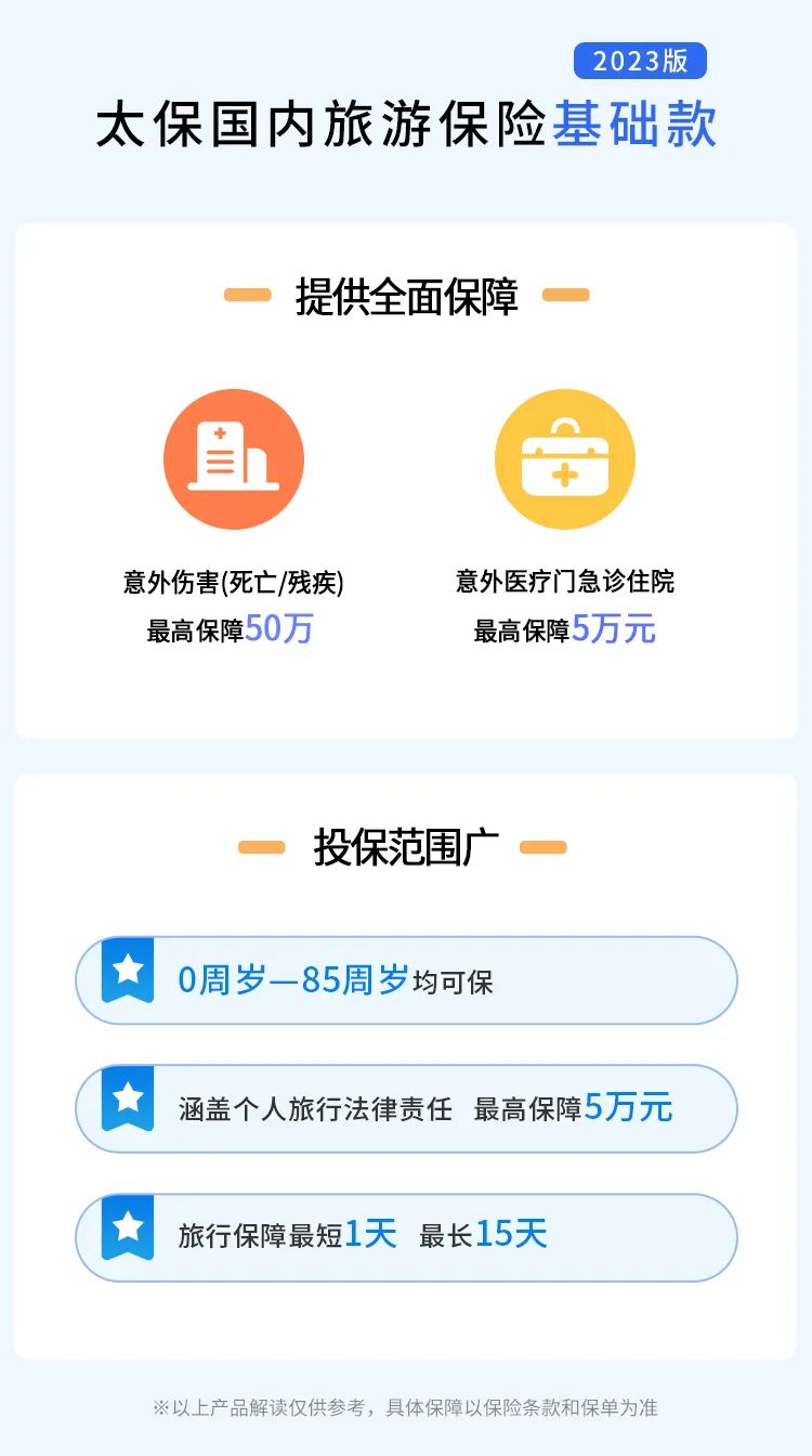 外出旅游在让自己放松心情的同时,也会发生一些意想不到的意外。为了进一步提高自己的旅行保障,您很有必要办理旅游保险。太平洋保险旅游险由于具有保费便宜、保障程度高的优势,因而成为很多人的首要选择。 太平洋旅游保险,也称太平洋旅游意外险,是太平洋保险公司专门针对旅游人士设计的保险种类,而且它价格也不贵,非常适合外出旅游人群投保。 太平洋国内旅游险好吗?作为知名保险公司推出的险种,太平洋的旅游保险可以给游客提供全方位的保障,包括意外伤残、意外身故等,同时它的保费也比较便宜,一天只需几元或是几十元,便可让自己放心游玩。如果您对“太保国内旅游保险基础款2023版”感兴趣,可以长按下图识别二维码或点击左下角“阅读原文”查看更多。