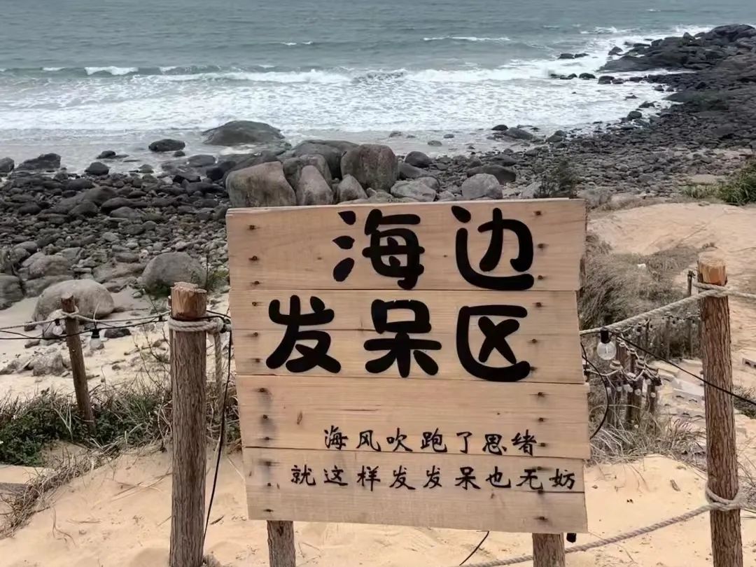 除了这些,海湾还有许多有趣的小角落,比如小山坡上有块牌子写着“海边发呆区”,再比如面朝大海的秋千……