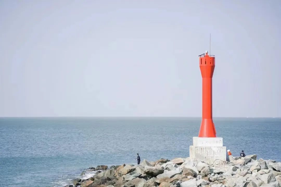 红色的灯塔在墨绿深蓝的海天之间显得尤其瞩目。