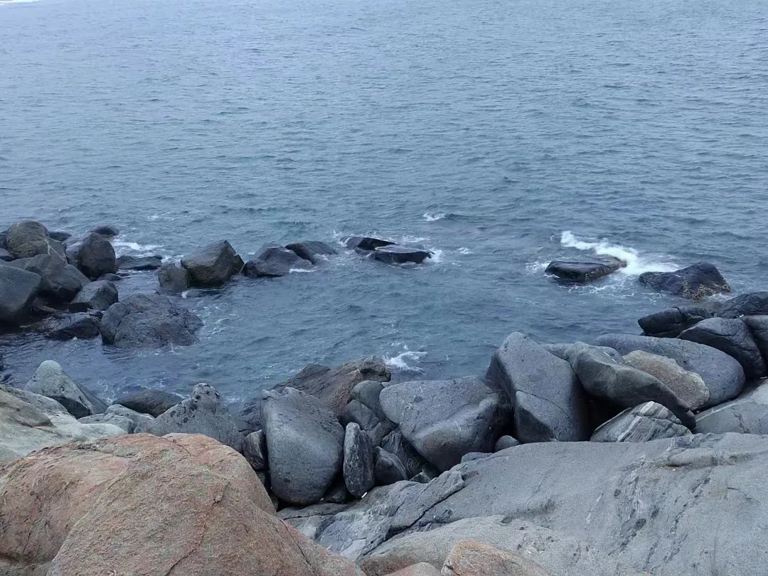 天然的礁石立在海岸边,大大小小不一而同。越深入海里,石头的表面越是光滑,体型越大。还有一座架海灯塔。