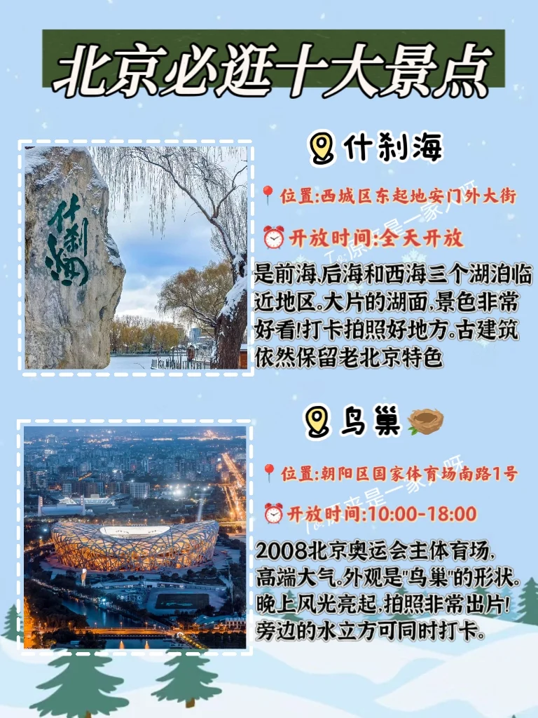 您现在的位置是:首页 > 国内旅游目的推荐 > 正文 国内旅游目的推荐 北京必去十大景点 admin2025年01月16日 08:20:38国内旅游目的推荐34 北京必去十大景点 拍照机位: 天安门📍北京C位 一定要早点起床去看升旗仪式 满满的震撼与感动 故宫📍在午门前背对阳光,让红墙绿瓦作为背景 鼓楼📍沿鼓楼大街向西走,巷子口是打卡点 什刹海📍乘船或者在画舫拍照,那感觉就是穿越了 天坛📍清晨的回音壁或午后的祈年殿🥰 鸟巢/水立方📍晚上亮灯后拍照出片儿 #总要来一趟故宫吧 #必去的地方 #北京 #北京攻略 转载请说明来源于"旅荐网",部分内容转载自网络,如有侵权请联系qlwl@foxmail.com删除 本文地址:https://www.15386.cn/post/28209.html 上一篇 北京CityWalk!必逛十大景点超全攻略~ 下一篇 澳门旅游,有些实话不得不说(附特色小吃) 相关文章 香港3天2晚旅行攻略 资讯 | 清明节假期出游提示:做好行程规划 文明绿色出游 用英文逛中国:这个网站能直接规划行程 假期正当时!快收好这份蟠桃山游玩攻略! 清明假期别浪费!3个AI神器让旅游攻略10分钟搞定 近期堪舆行程安排 异乡好居新加坡2026直播季(附直播行程安排) 北京春季旅行攻略皇城春意,花开满城 游玩攻略已备好,速码出发,下一站桓台! 2026年行程计划(有更新) 发表评论 取消回复 评论列表 这篇文章还没有收到评论,赶紧来抢沙发吧~