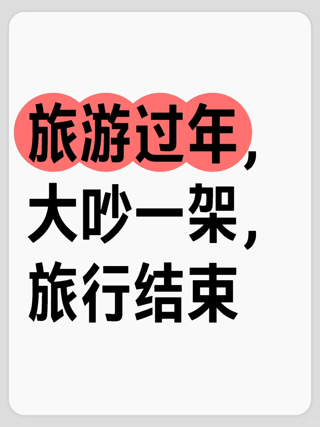 第一次选择春节出门旅游,已踩雷。一去一个不吱声。\n旅游景点人山人海,前行一步都极其困难,目之所及全是密密麻麻的人群,犹如在观看人类大迁徙。想拍照留念到此一游就更难,背景只有人从众。看个景区表演,自己先上演一出穿越人墙,个子不高的直接啥都看不到。\n室内区域更是挤得像菜市场一样,加上空气不流通,体质不好的人估计会挤到头晕。\n交通方面,动车票难买不说,连坐城轨都坐出了早晚高峰挤地铁的感觉,车门附近全站满了人。打车是根本打不到的,景区附近的道路堵得像停车场一样,十分壮观。\n吃饭排队久,住宿价格翻倍。春节旅游完全是边花钱边受罪。\n大家不是都回家过年了吗,咋这么多人在旅游景区啊啊啊啊啊。\n#好好过年大赏#春节旅游 #旅游攻略#旅游 #留守过年也要被祝福 #春节#过年#避雷 #这就是过年的意义吧 #chinatravel