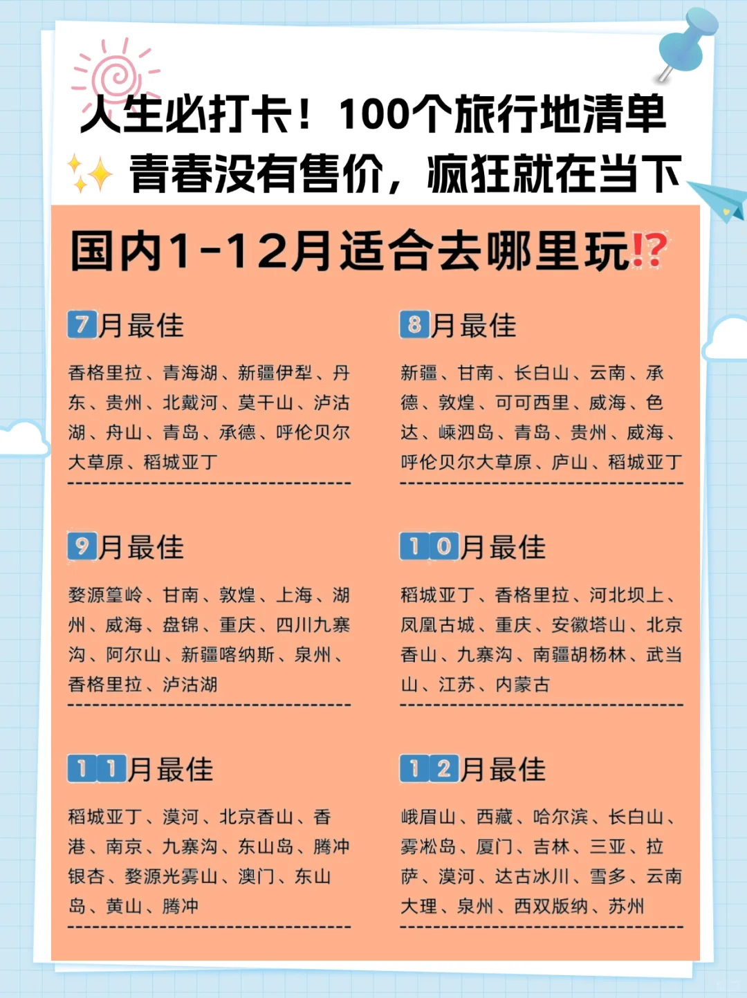 春节即将结束,是时候计划一下今年都要去哪玩了\n还没有思路的宝子们看过来❗️\n小编整理了一份旅行清单✅,每个月都有独特的风景和适合旅游的城市,赶紧码住~\n \n1-12月旅游地推荐👇🏼👇🏼\n✅1月\n赏雪❄️:长白山、哈尔滨、漠河、西藏拉萨、阿勒泰\n避寒🏝️:丽江、昆明、海南三亚、西双版纳、厦门鼓浪屿、广州、涠洲岛\n \n✅2月\n春节🧨新年旅行:北京、西安、成都、张家界、黄山、厦门、杭州、南京、重庆、三亚\n \n✅3~4月\n春游赏花💐:武大樱花园、南京梅花山,杭州西湖、婺源油菜花、伊犁杏花、无锡樱花🌸、三亚、林芝、大力、兴义万峰林、太行山\n \n踏青&观鸟:青海湖、黄山九寨沟、哈尼梯田、呼伦贝尔、武汉、桂林、四川、丽江、伊犁、张家界、乌镇、苏州、汉中、青岛、平潭岛、扬州\n \n✅5月\n五一假期出游:九寨沟、三亚、香格里拉、桂林、伊犁喀拉峻草原、澜洲岛、苏州、成都、黄山、鼓浪屿、大理、稻城亚丁、西安、贵州\n \n✅6月\n错峰出行:成都、伊犁、青海甘肃、舟山群岛、大理、丽江、泸沽湖、三亚、桂林🍃、荔波、甘南、呼伦贝尔、青岛、大连🌊\n \n✅7~8月\n避暑旅行:新疆、贵州、黄山、成都、青海湖、五台山、千岛湖、丹东、北戴河、香格里拉、三亚、舟山\n \n亲水赶海:桂林、威海、天山天池、赛木里湖、长江三峡、广西涠洲岛🏝️、福建东山岛、厦门、海南、广西北海\n \n✅9-10月\n赏秋:南京栖霞山🍁、九寨沟、黄山、稻城亚丁、塞罕坝、喀纳斯、香格里拉、泸沽湖、辽宁盘锦、丽江、桂林、丹东、呼伦贝尔\n \n✅11-12月\n赏雪&避寒:北京、喀纳斯、大连、雾淞岛、厦门、上海、苏州、黄山、峨眉山、梅里雪山、大理、丽江、三亚、泉州、长白山、西藏\n \n全年都适合的旅行城市🏙️:\n西安、北京、上海、杭州、成都、重庆、青岛、厦门、长沙、广州、南京、武汉、山西、大理……\n \n#新东方文旅 #旅游 #旅游推荐 #旅游攻略 #旅行 #旅行推荐官 #小众旅行地 #带娃旅行 #一生中值得去旅游的地方 #新年旅行第一站